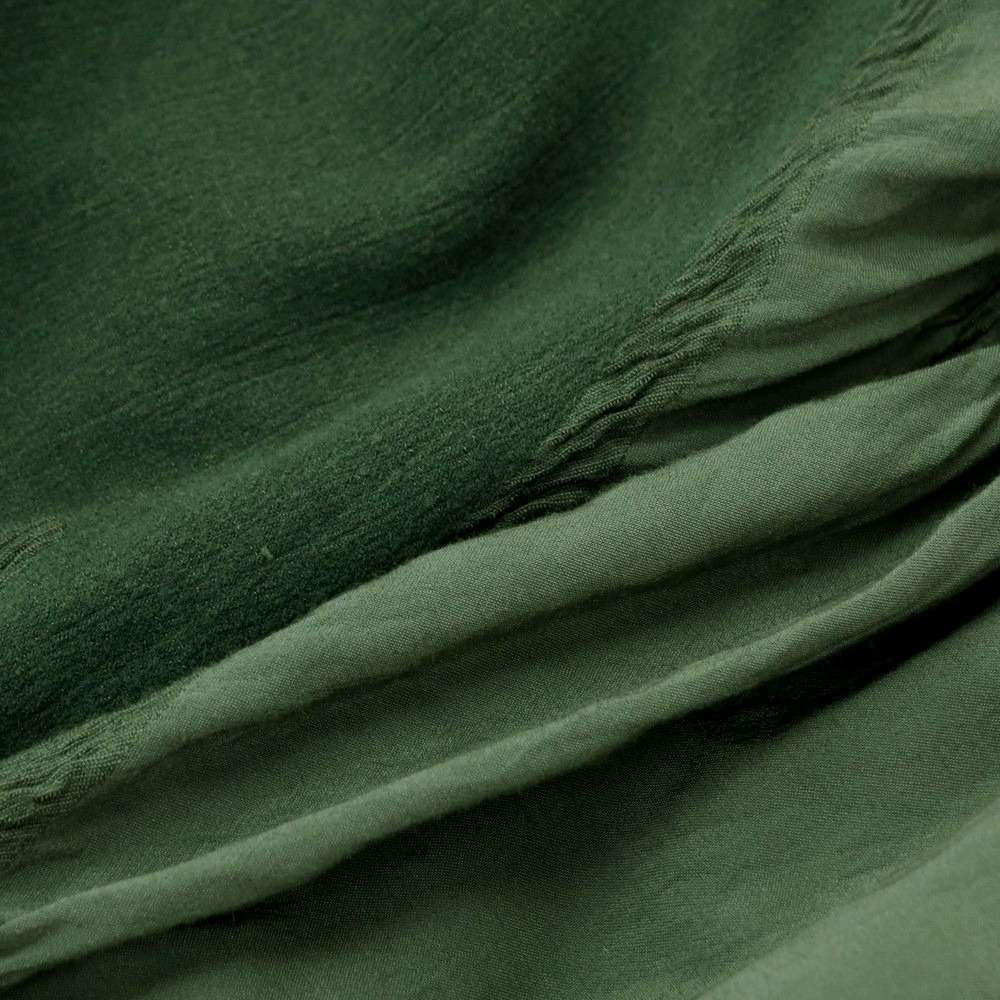 やや光沢のあるドライタッチなポリエステル系素材を使用した、ワンピースです。伸縮性のある糸を織り込み、製品染めによる収縮で生まれる有機的なシルエットが特徴で、首元の結ぶディテールは葉っぱを連想させるデザインとなっており、他とは一味違った洒落感のあるコーディネートをお楽しみいただけます。