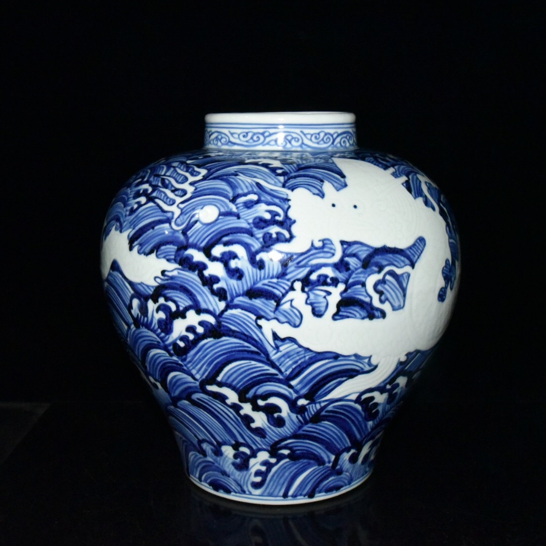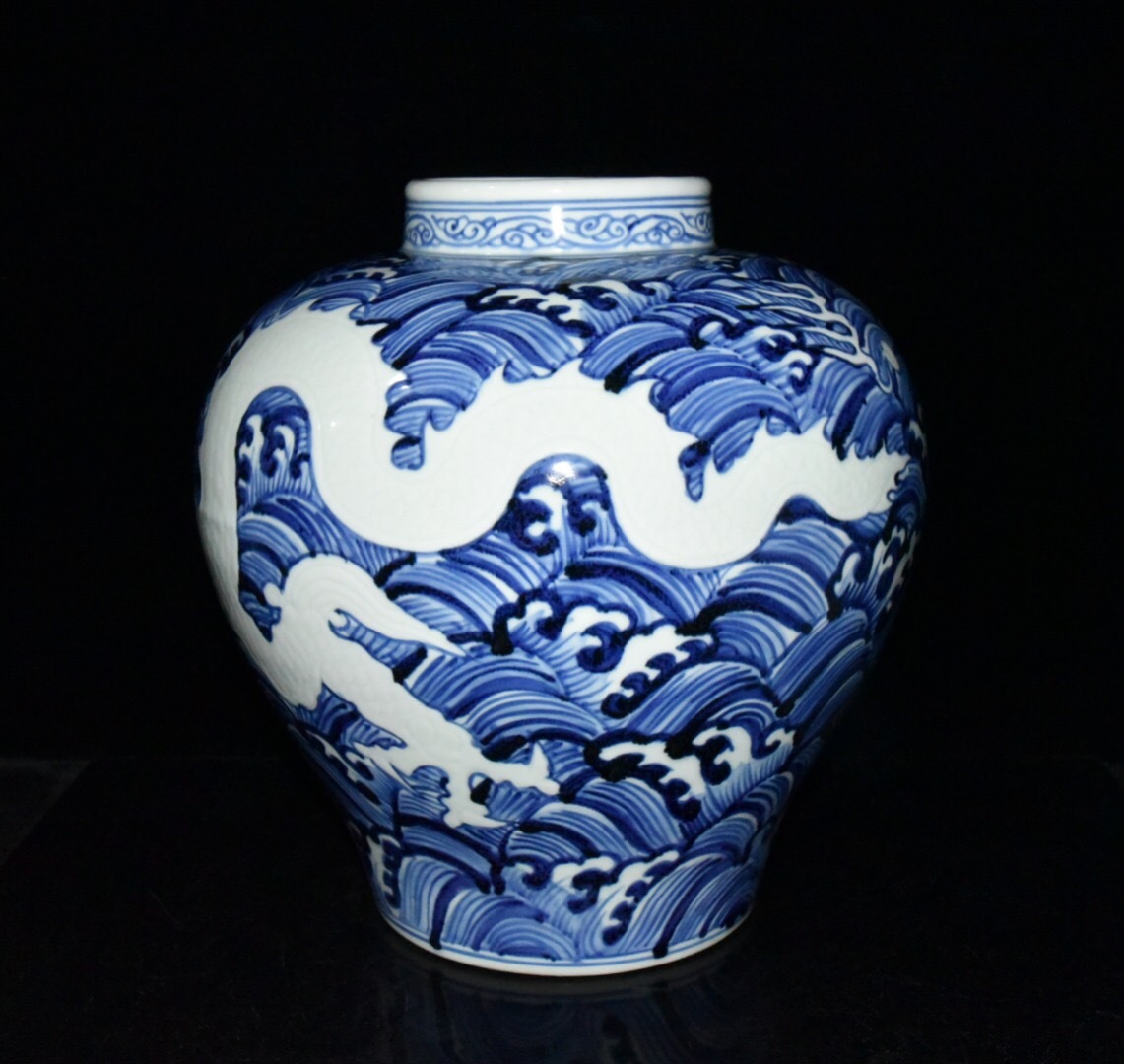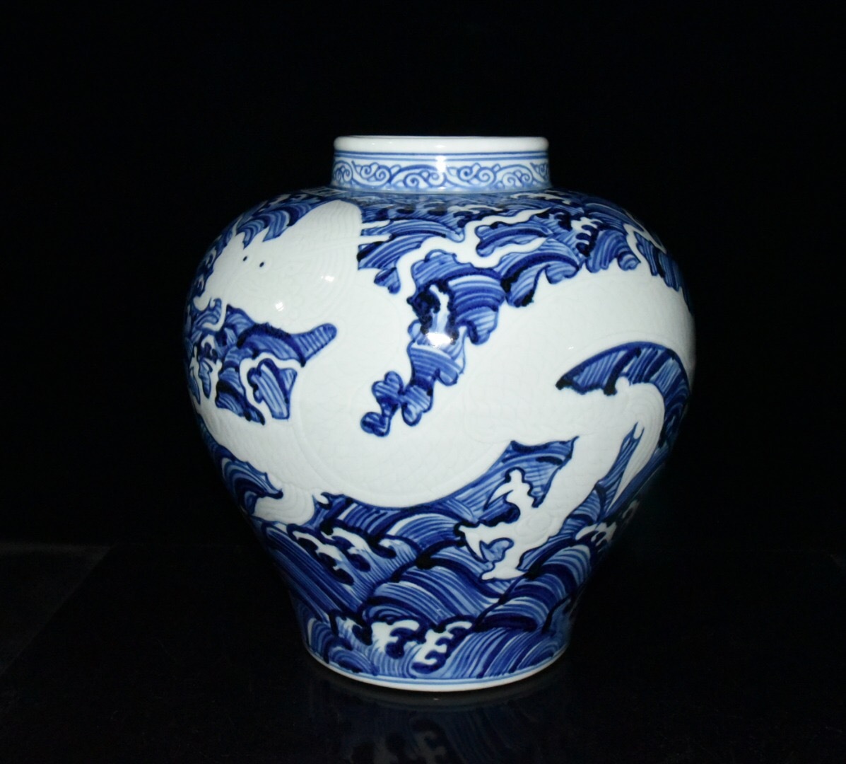 【超珍館蔵】明 永樂年製款 古陶瓷品 青花 海水龍紋罐 置物 古賞物 古美術品 稀少珍蔵品