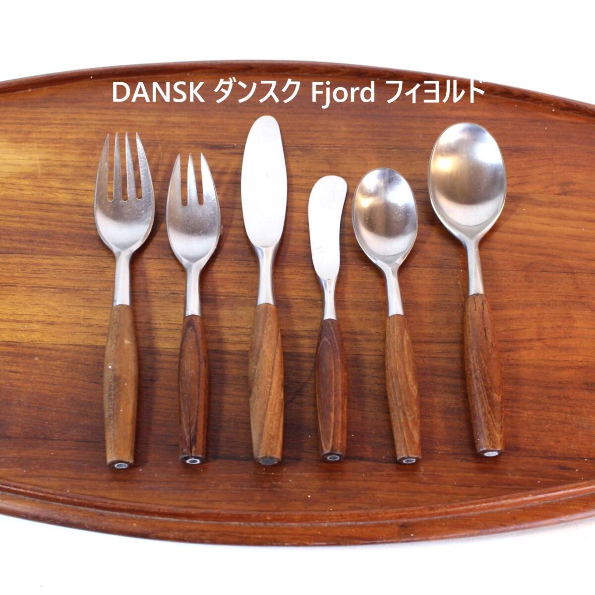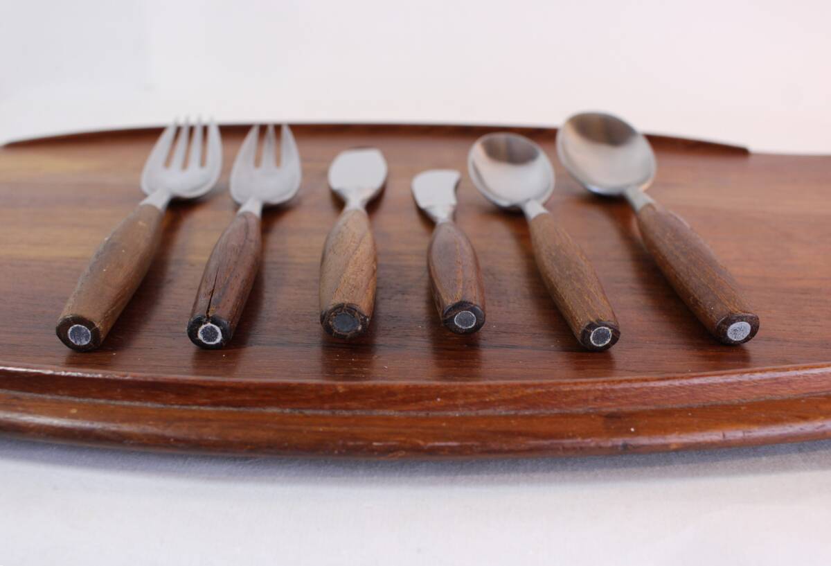 無垢のステンレスとチーク材の組み合わせが美しい、1953年デザインのダンスク社 “Fjord フィヨルド” カトラリー【大スプーン 大フォーク ナイフ 小スプーン 小大フォーク バターナイフ】の6本セットです。