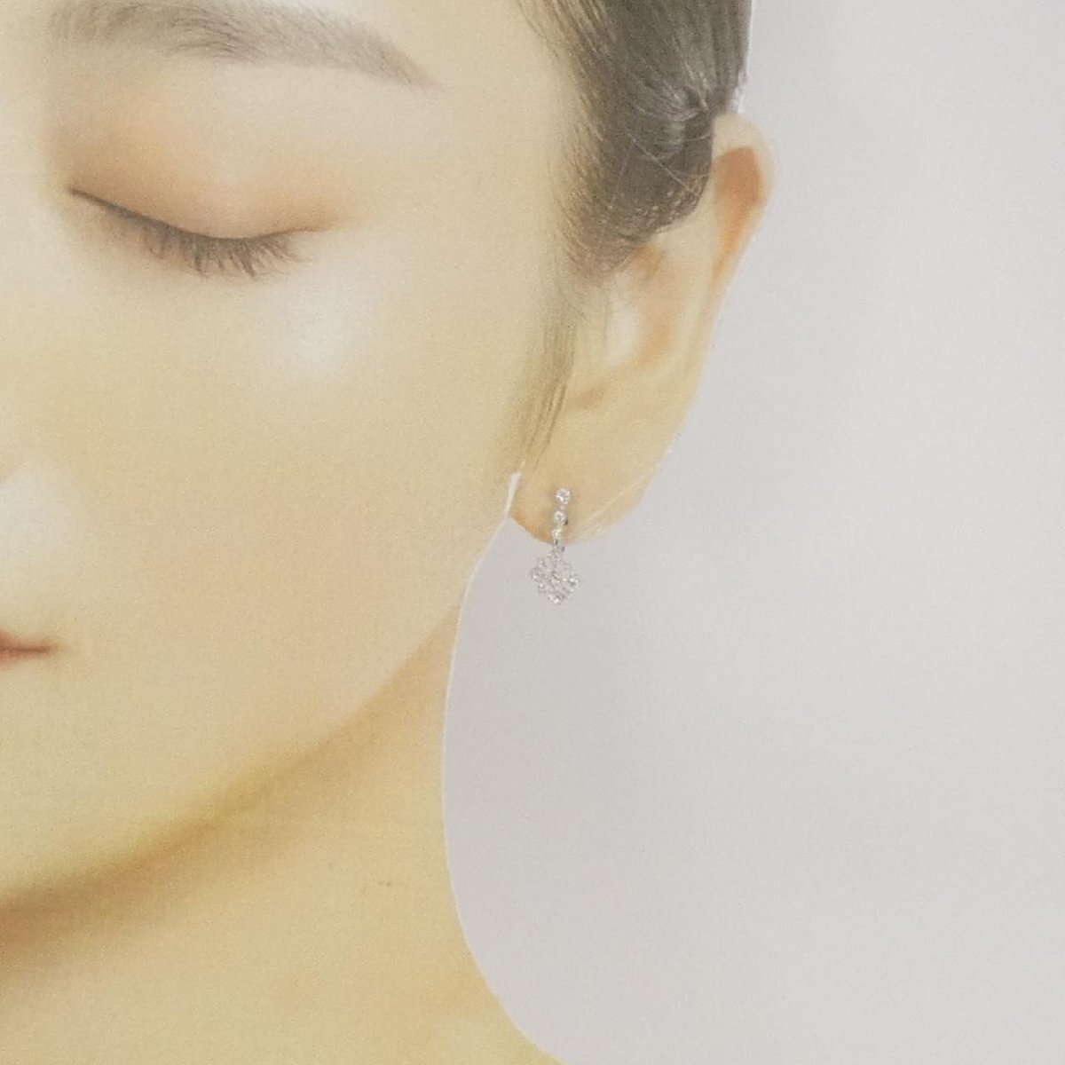 照りのあるダイヤモンドがあしらわれたイヤリング。耳元で揺れて、キラキラと光を放ちます。