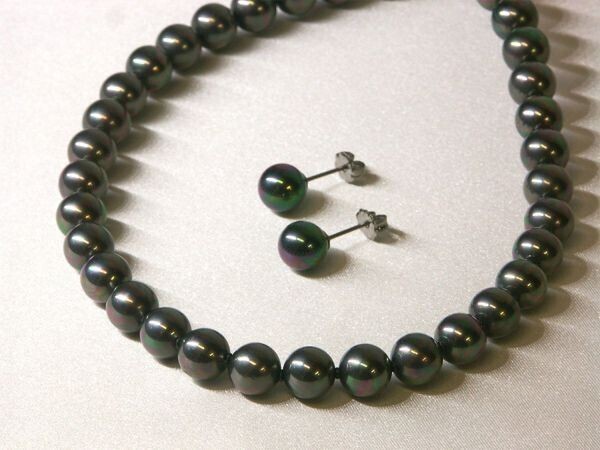 まつよ 花珠貝パールネックレス ピアスセット 42cm 黒真珠ピーコックカラー9ミリ42センチピアス koapkpn-09-1-42-pias
