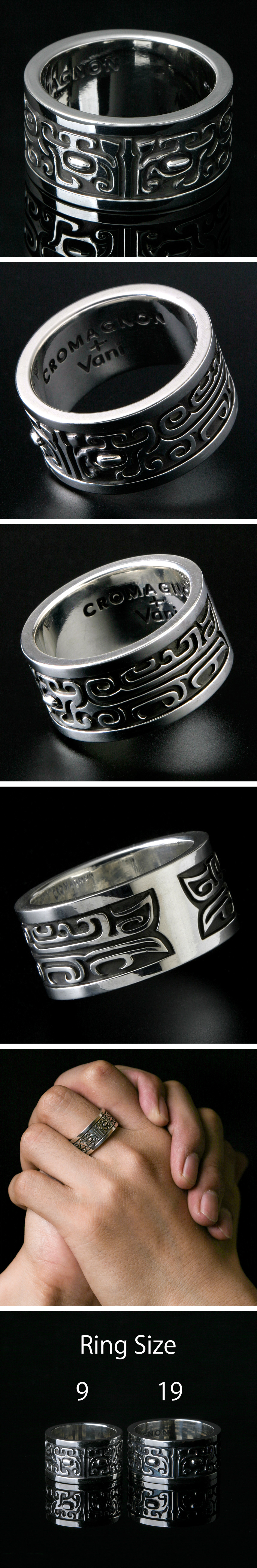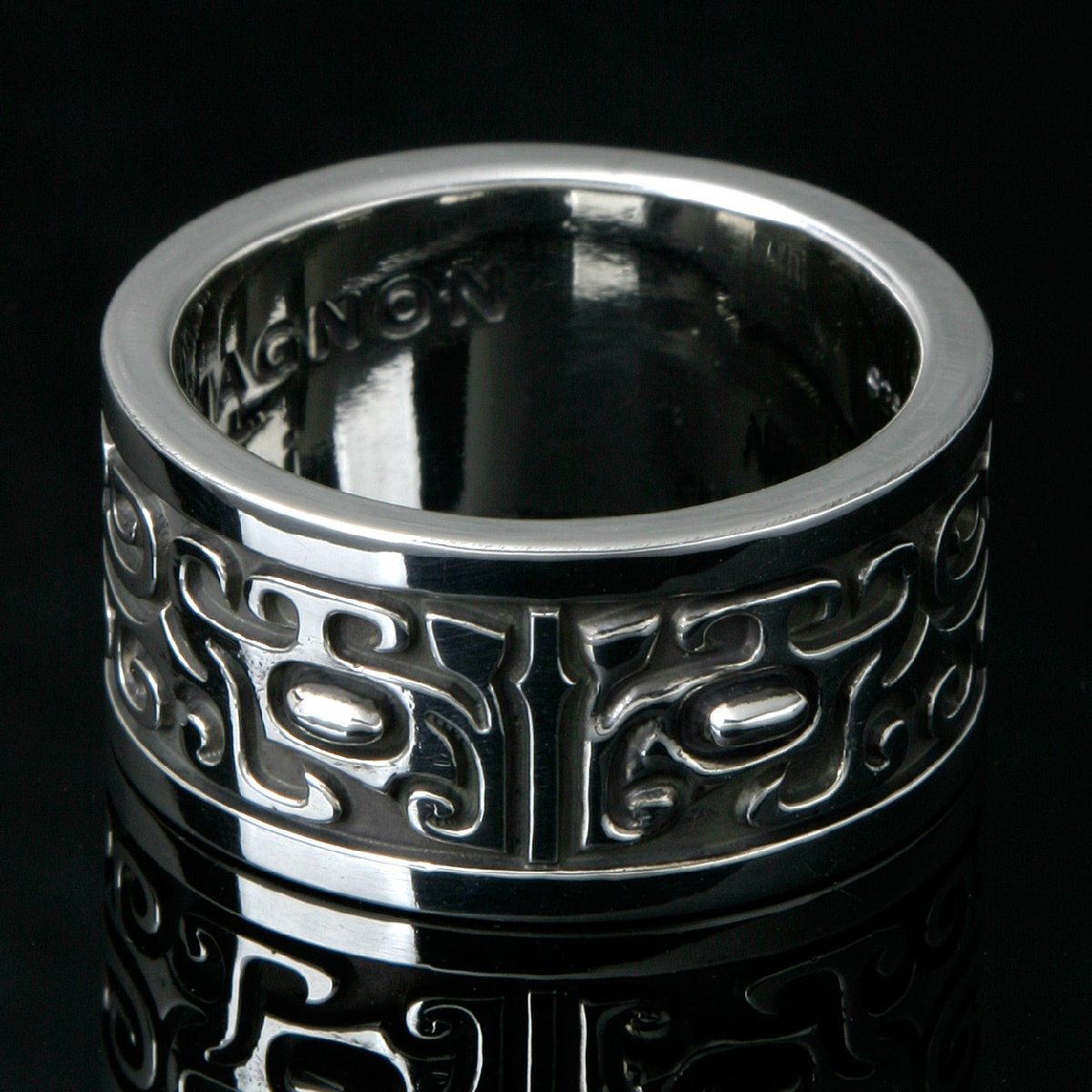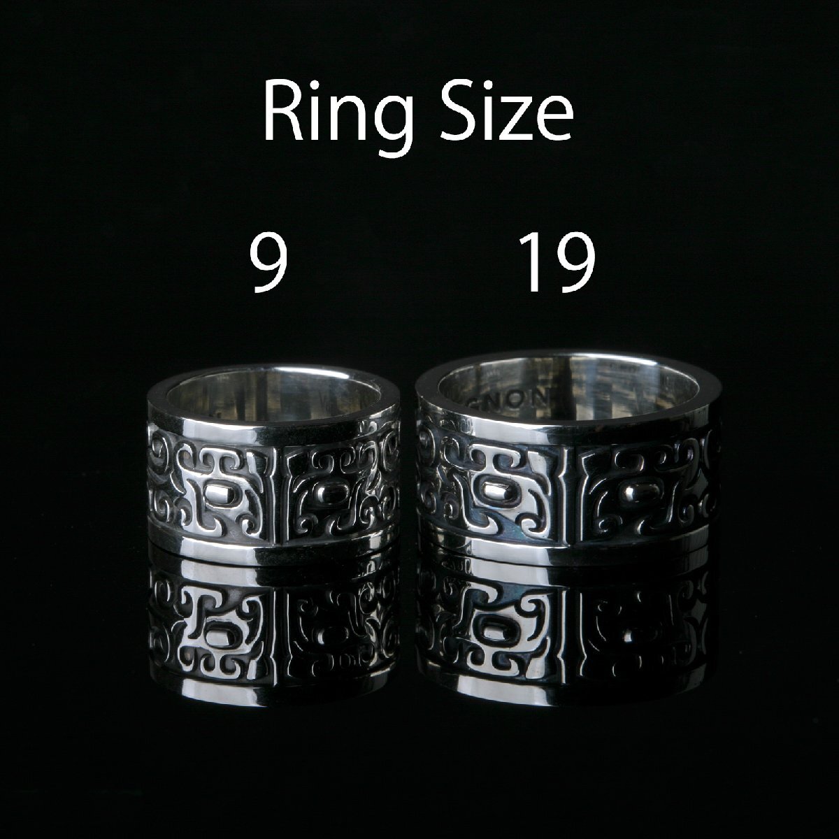 中国古代、原初の龍 古代の青銅器に現われる龍をテーマにしたシルバーリングです。 古代王朝「殷」、殷人は祭礼用青銅器の器面に想像力を駆使し、龍を含む神々の姿を創造しました。 古代人の想像力から造られた龍の姿は一様ではなく、この時代様々な「龍」的姿形が存在しました。 その原初の姿をシルバーアクセサリーに移しこみ、新しい命を吹き込みました。 メンズ/レディース兼用。 誇張された奇怪な文様 正視する「龍」の顔が浮き出した極太なフォルム。 流麗な文様は側面から裏側にまで回りこみ、視点を変えると二頭の龍が鼻梁で頭を突きあわせた姿形が見えてきます。 不気味な形相、飛び出した一対の目。誇張された奇怪な文様は邪悪なものに打ち勝つための強大な力の象徴です。 指先に与える強烈な存在感と造形は多くの目を惹きつけ、心に留まることでしょう。 身に着ける者のアクセサリーの歴史に刻まれる逸品になることを期待します。 ※色はできる限り正確に表現するよう努めていますが、モニターやモバイル機器の設定、撮影時の照明、写真の拡大などの違いにより、実物よりも大きく太く、実際の色と異なって見える場合があります。 キーワード リング 龍 【素材】 スターリングシルバー SV925(銀純度92.5%) 【寸法】 9号/直径19.2mm×高さ11mm×厚さ1.5mm 8.7g 15号/直径21.1mm×高さ11mm×厚さ1.6mm 10.7g 19号/直径22.9mm×高さ11mm×厚さ1.7mm 12.9g(掲載写真) 25号/直径25mm×高さ11mm×厚さ1.8mm 16g 29号/直径26mm×高さ11mm×厚さ1.9mm 16.5g 【サイズ】 9号、11号、13号、15号、17号、19号、21号、23号、25号、27号、29号 【生産国】 日本 ![]() サイズガイド