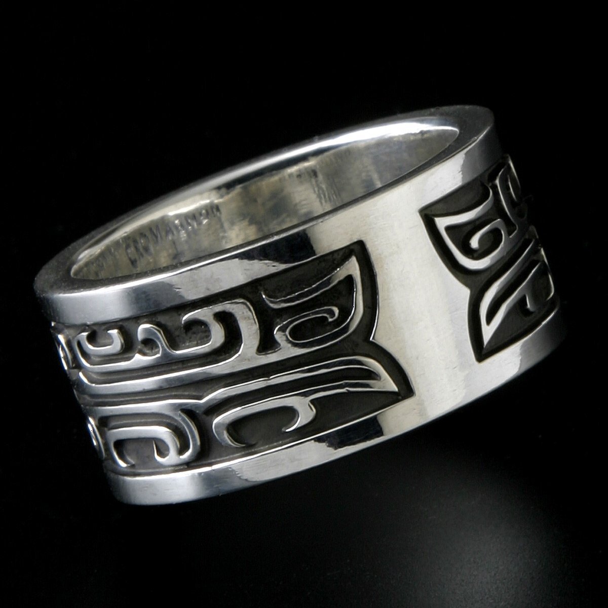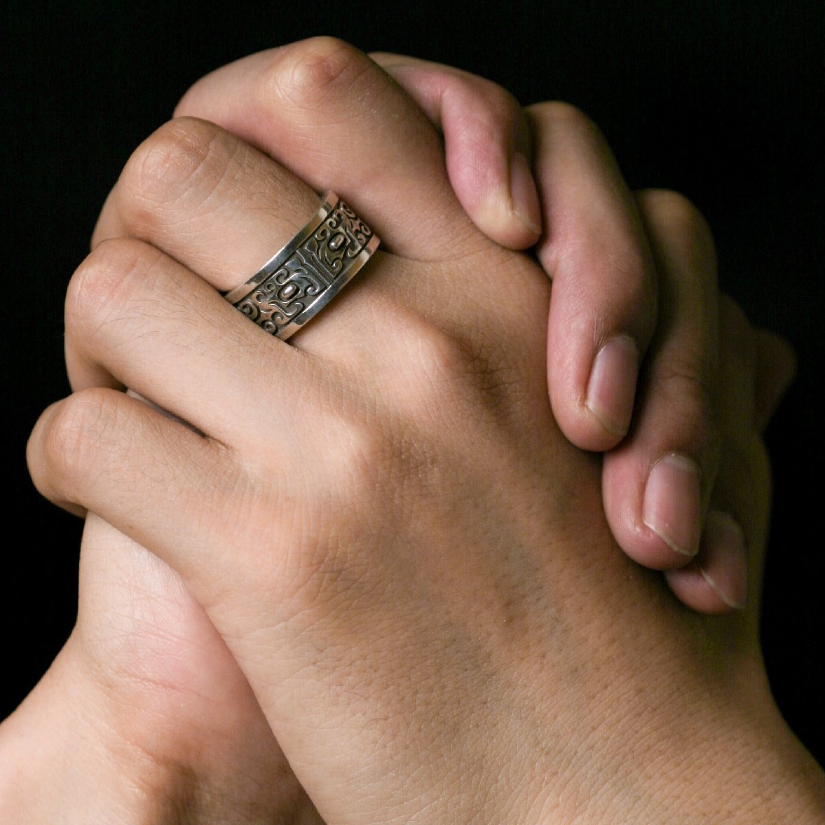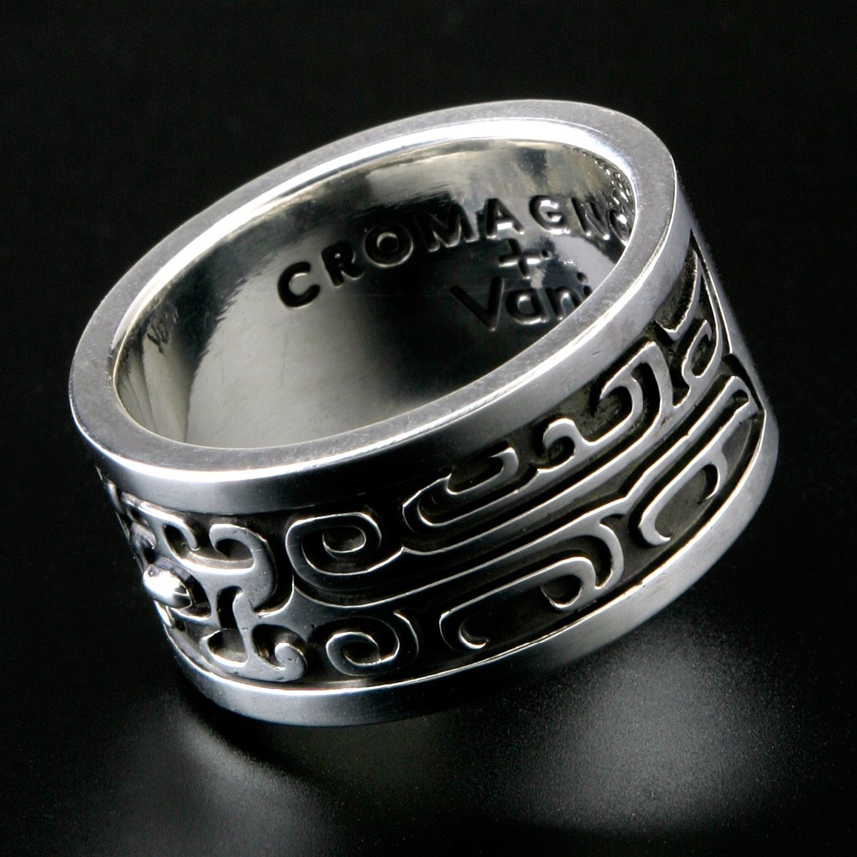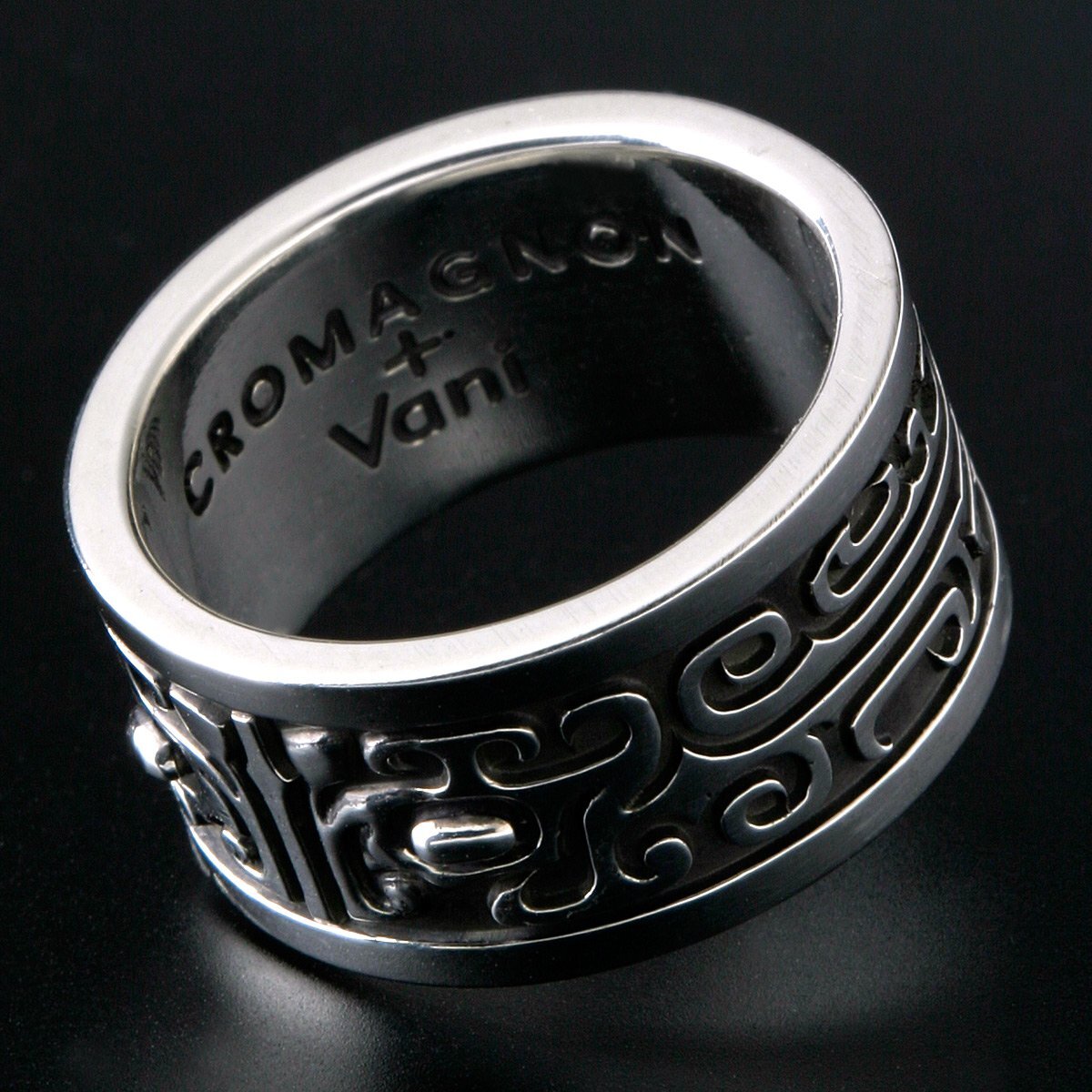 中国古代、原初の龍 古代の青銅器に現われる龍をテーマにしたシルバーリングです。 古代王朝「殷」、殷人は祭礼用青銅器の器面に想像力を駆使し、龍を含む神々の姿を創造しました。 古代人の想像力から造られた龍の姿は一様ではなく、この時代様々な「龍」的姿形が存在しました。 その原初の姿をシルバーアクセサリーに移しこみ、新しい命を吹き込みました。 メンズ/レディース兼用。 誇張された奇怪な文様 正視する「龍」の顔が浮き出した極太なフォルム。 流麗な文様は側面から裏側にまで回りこみ、視点を変えると二頭の龍が鼻梁で頭を突きあわせた姿形が見えてきます。 不気味な形相、飛び出した一対の目。誇張された奇怪な文様は邪悪なものに打ち勝つための強大な力の象徴です。 指先に与える強烈な存在感と造形は多くの目を惹きつけ、心に留まることでしょう。 身に着ける者のアクセサリーの歴史に刻まれる逸品になることを期待します。 ※色はできる限り正確に表現するよう努めていますが、モニターやモバイル機器の設定、撮影時の照明、写真の拡大などの違いにより、実物よりも大きく太く、実際の色と異なって見える場合があります。 キーワード リング 龍 【素材】 スターリングシルバー SV925(銀純度92.5%) 【寸法】 9号/直径19.2mm×高さ11mm×厚さ1.5mm 8.7g 15号/直径21.1mm×高さ11mm×厚さ1.6mm 10.7g 19号/直径22.9mm×高さ11mm×厚さ1.7mm 12.9g(掲載写真) 25号/直径25mm×高さ11mm×厚さ1.8mm 16g 29号/直径26mm×高さ11mm×厚さ1.9mm 16.5g 【サイズ】 9号、11号、13号、15号、17号、19号、21号、23号、25号、27号、29号 【生産国】 日本 ![]() サイズガイド