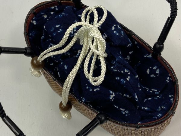 <素 材>巾着部分 綿100%  籠部分 竹、合皮 持ち手 ポリ紐、木製