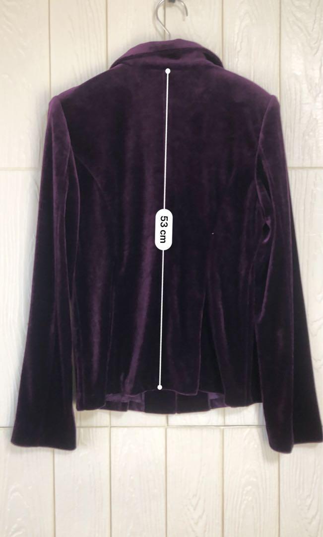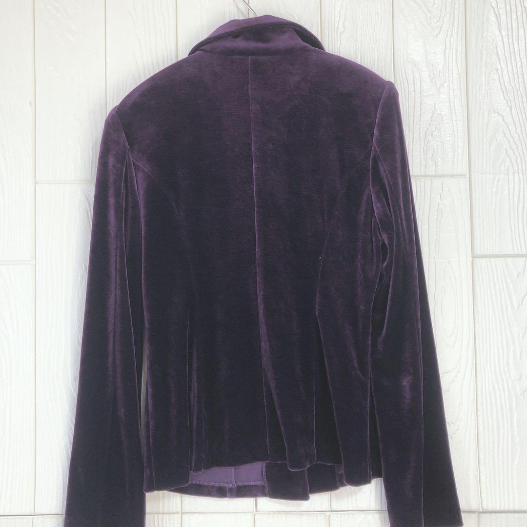 パープルのベルベット素材のジャケット、エレガントなデザインでフォーマルシーンに最適。
