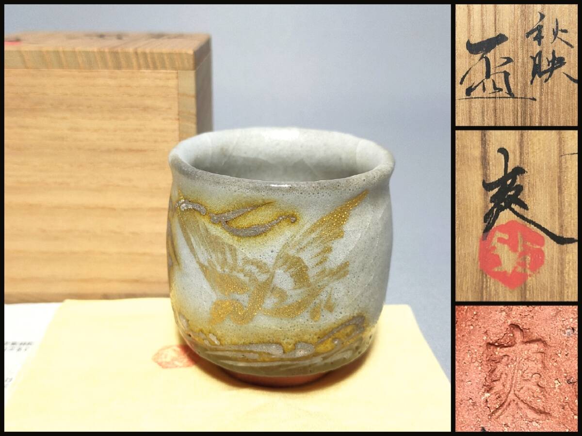 FA16 京焼 酒器 鈴木爽司 造 秋映 盃 色絵金彩鶴文 ぐい呑 栞・共布・共箱 師:富本憲吉