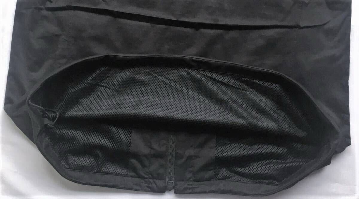 ◎マットなブラックに両胸やバックのロゴプリントがきまっています。裏地にはメッシュつき、裾はドローコードで調整可。