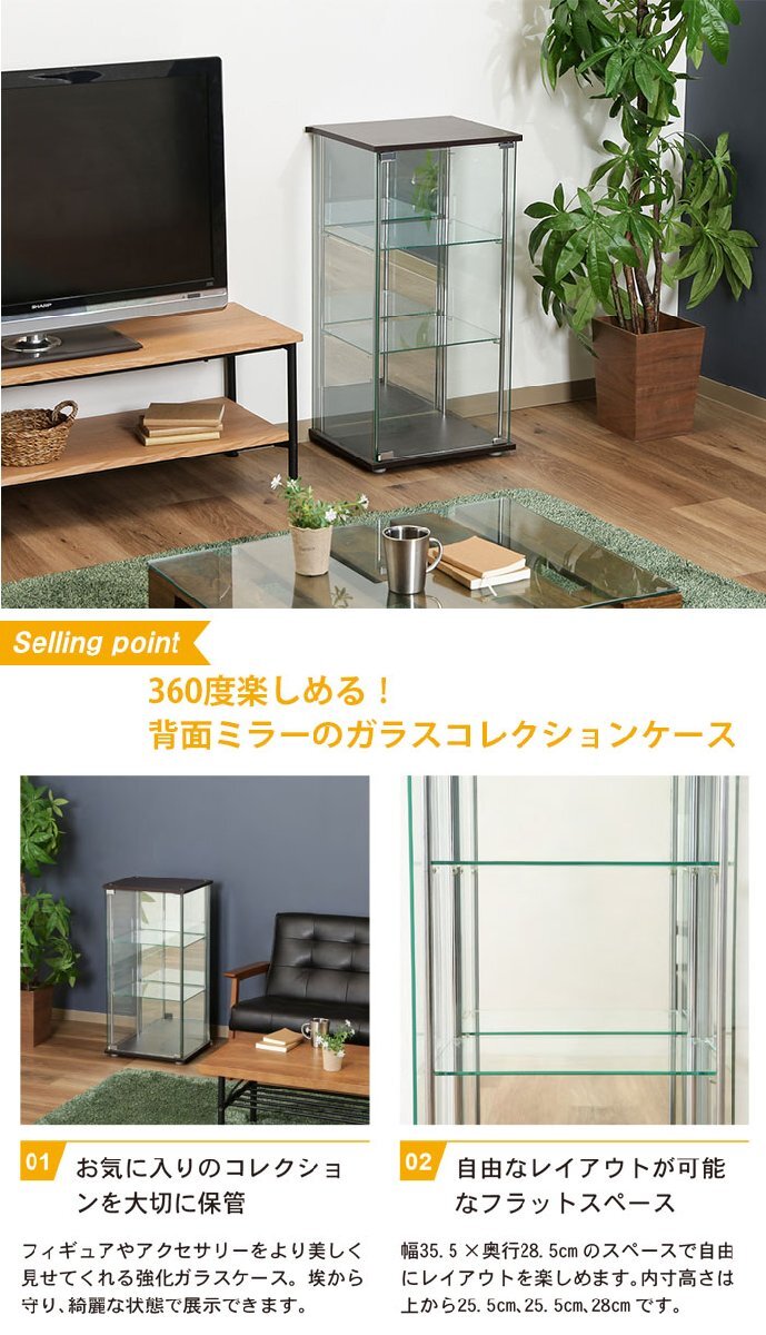 | 大事なコレクションを見せながら収納できる、背面ミラー付きガラスコレクションケースです。 フィギュア、ミニカー、ルアー、大きめの人形など、お好みに合わせたコレクションキャビネットとしてお使いいただけます。 背面に鏡がついているのでフィギア等の後姿が見られます。 また、部屋の奥行を広く見せる効果があります。 棚板は5mmの強化ガラスを使用しております。 通常のご使用であればまず割れる心配はございません。 大事な小物にほこりが付きにくく便利なアイテムです。 |