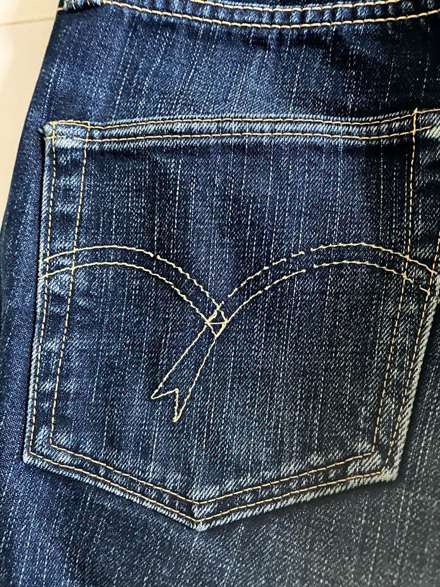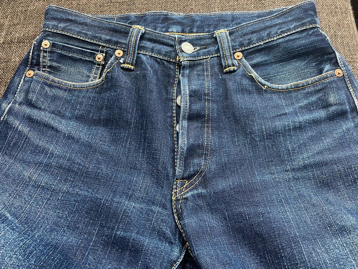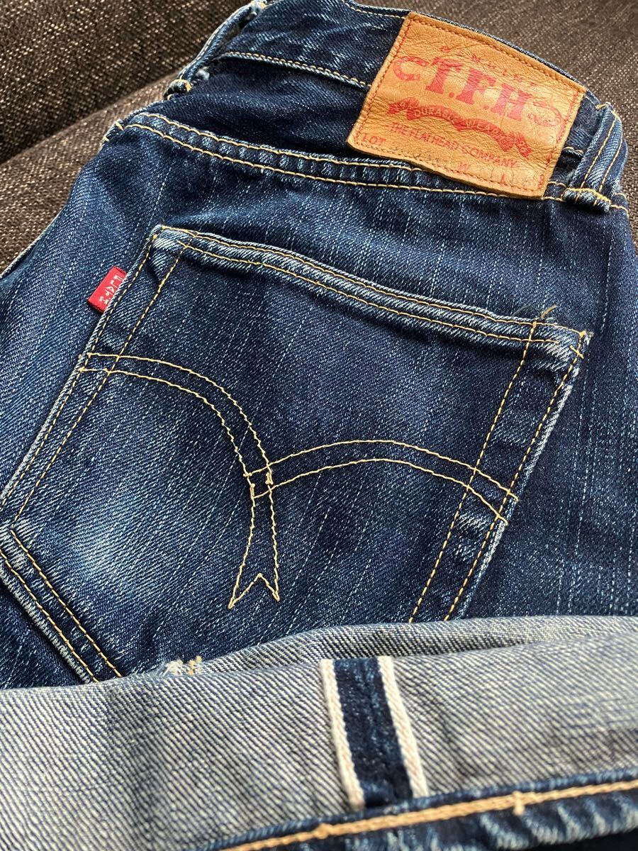濃紺の状態に色落ち、縦落ちがとてもキレイに出始めた美色の一本です。