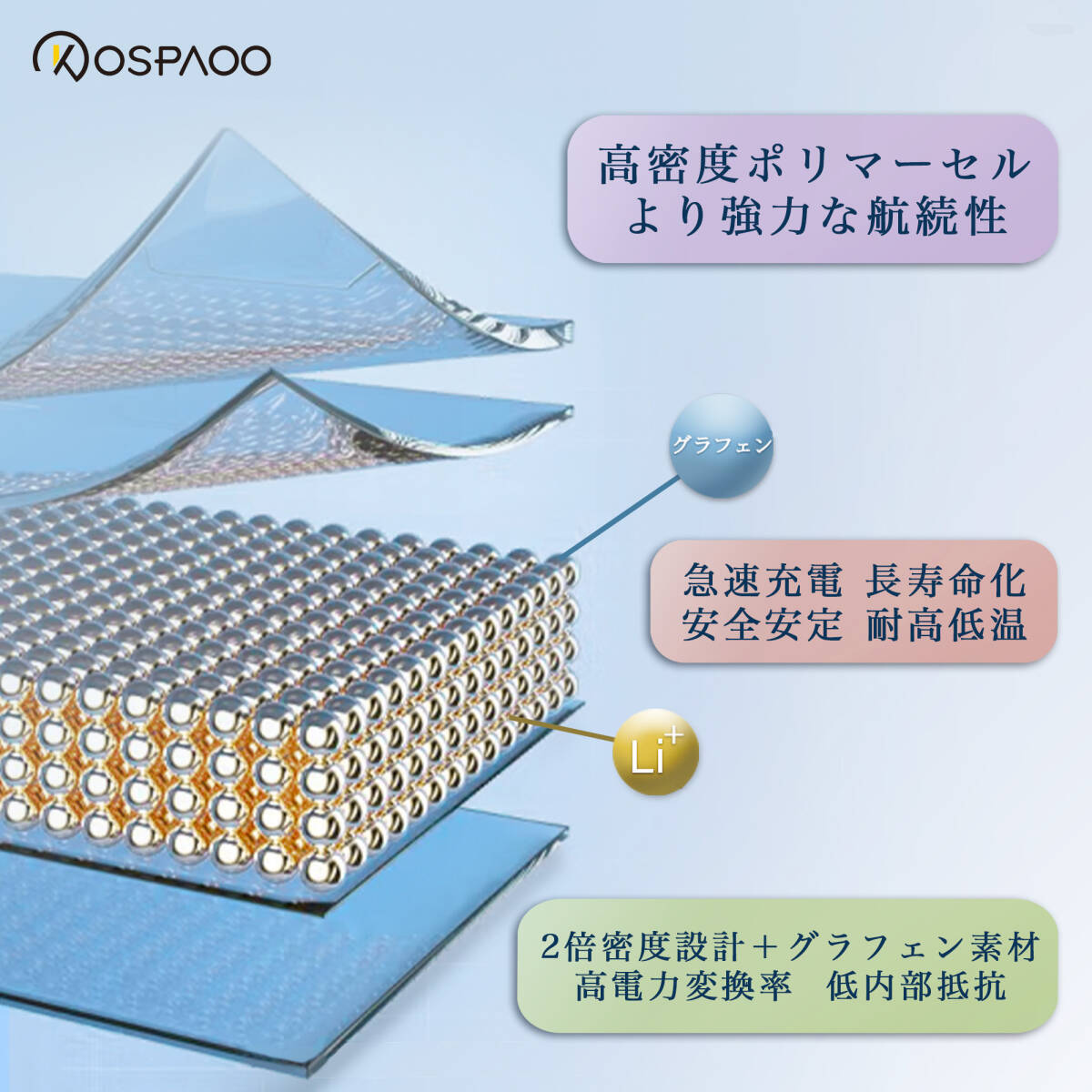 コバルト酸リチウム、グラフェン、有機電解質などの先端材料を使用し、安全性、信頼性、環境性、耐久性、放熱ブロック、極めて膨張しにくいなど、日本や欧州で義務づけられている安全性試験をクリアし、さらに1億円の保険に加入しているので、安心して購入できるバッテリーです。