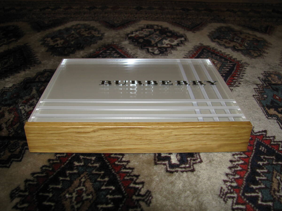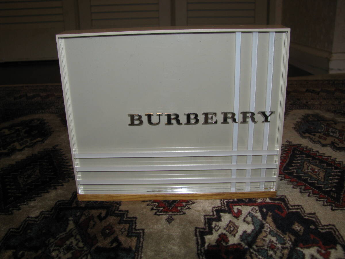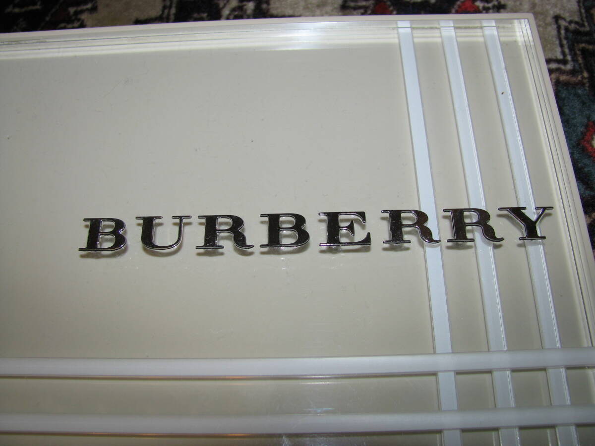 BURBERRYの店舗用ディスプレイです。透明部分はアクリル、土台部分はウッド、サイズは約20X17X3㎝です。送料1000円(北海道、沖縄1400円)でお送りいたします。