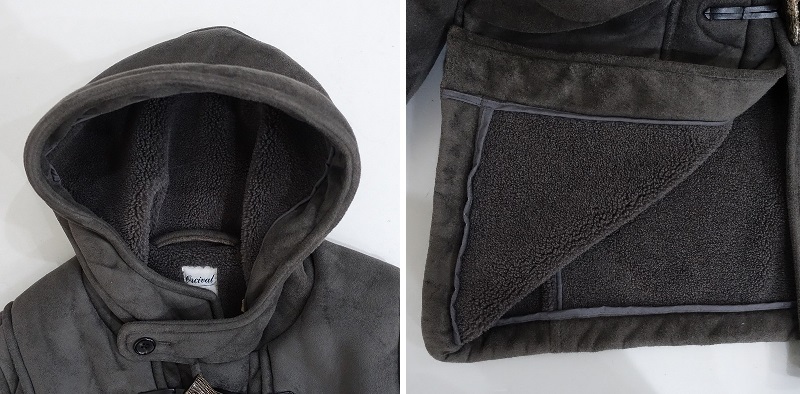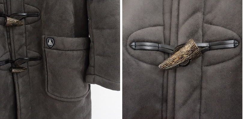 ORCIVALのフェイクムートンダッフルコートです。カラーはダークグレーでフェイクムートン地で仕立てられております。フード付き、フロントはトグルボタン仕様で、両腰にポケットが付いております。 |