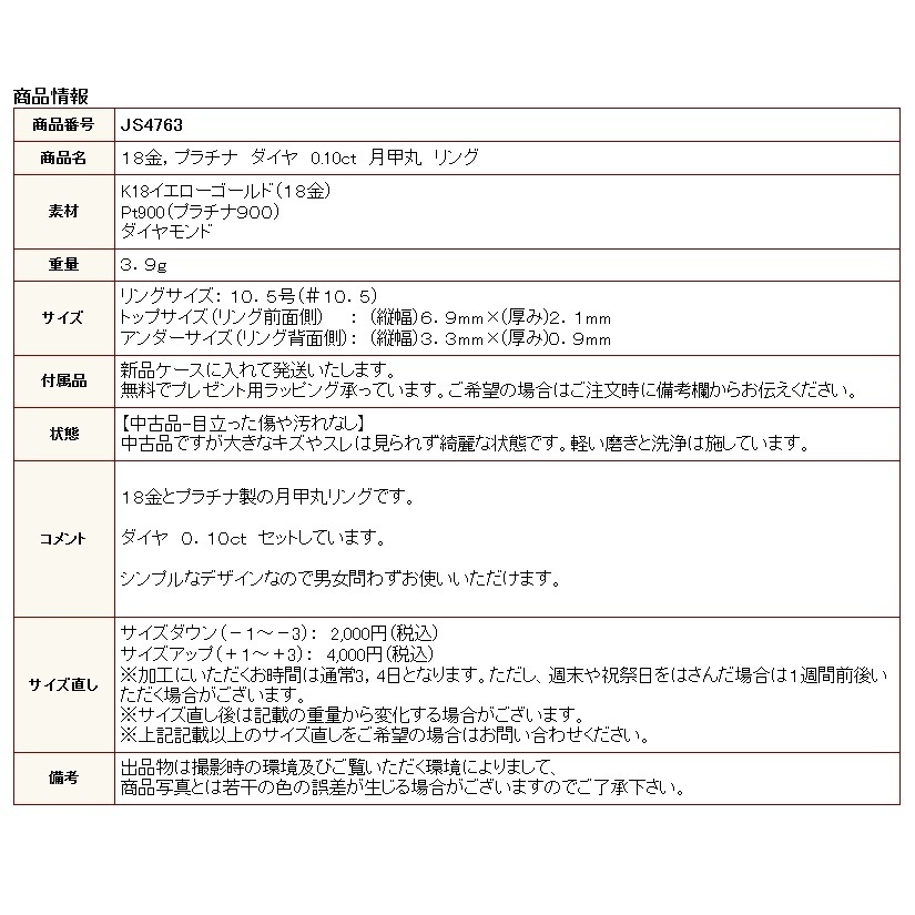 商品名 | 18金,プラチナ ダイヤ 0.10ct 月甲丸 リング |