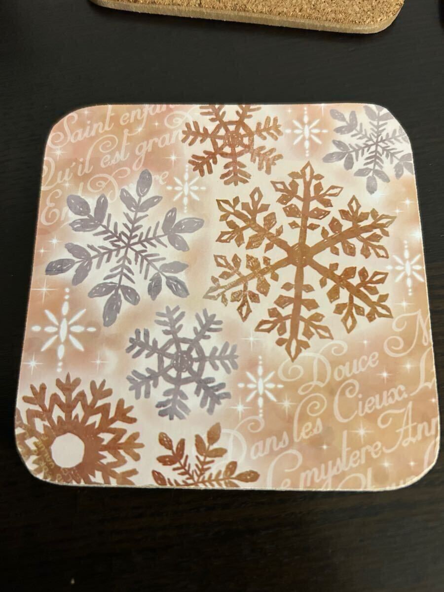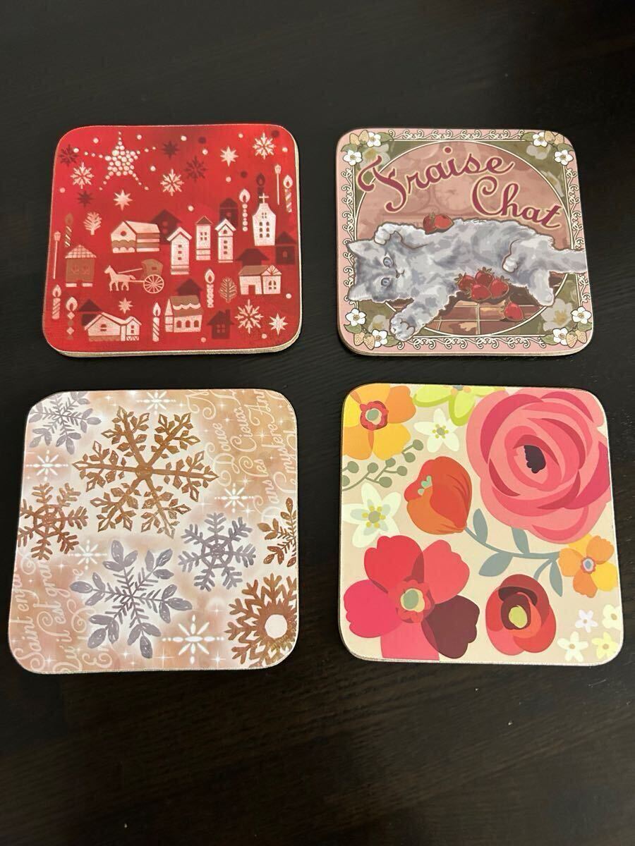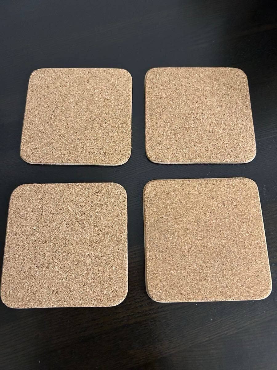 木の素材に紙製シート(上)、コルクシート(下)が貼られたコースター4枚です。