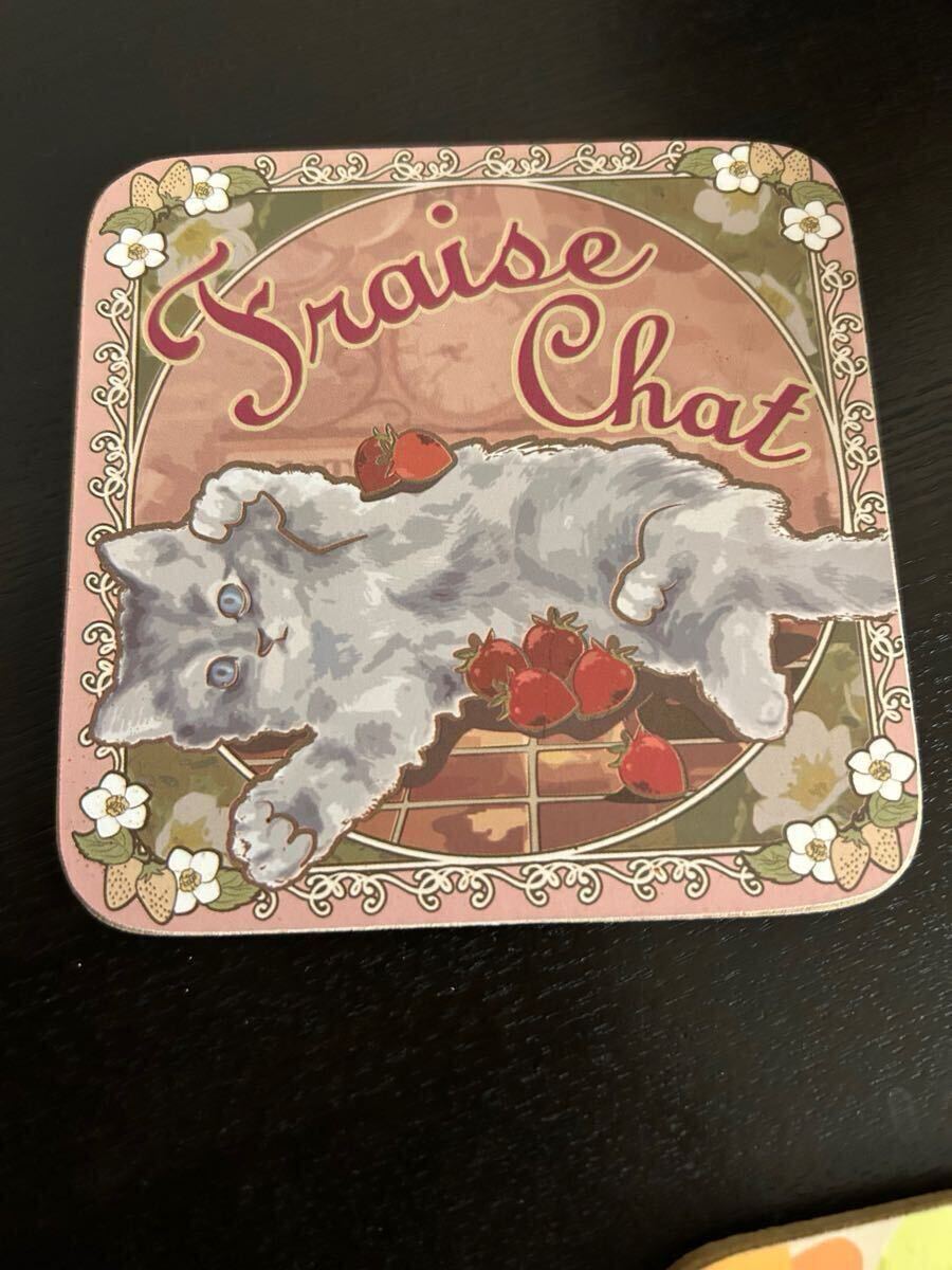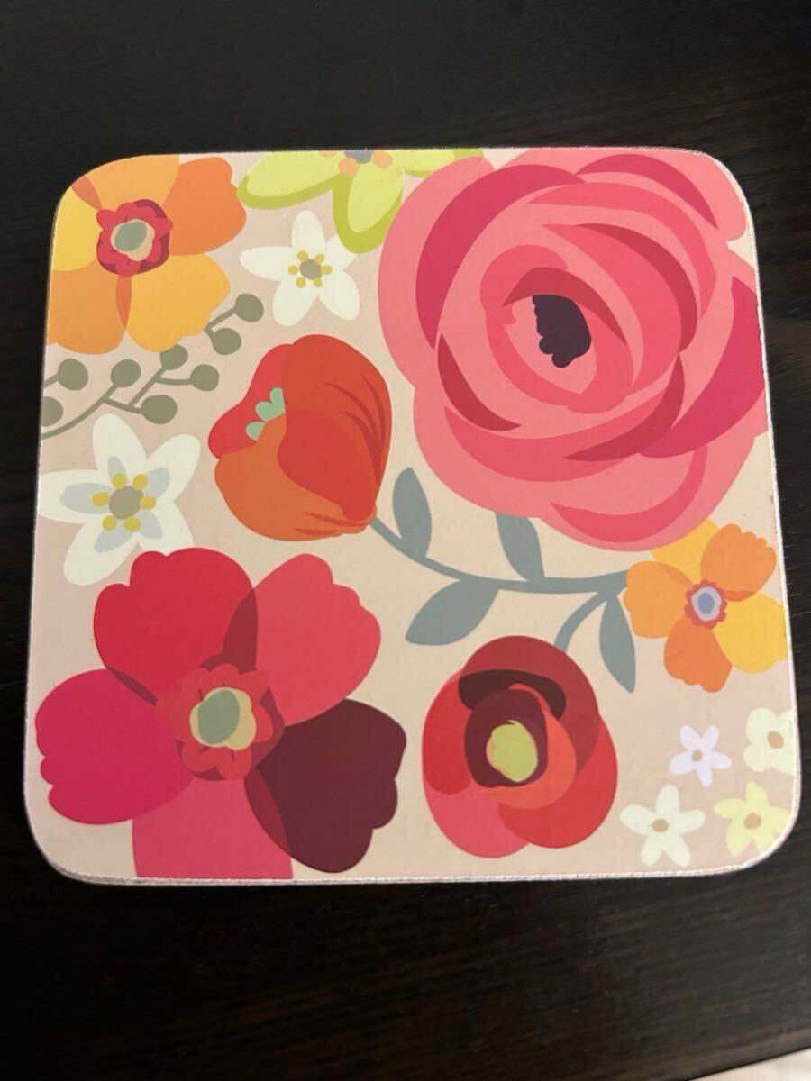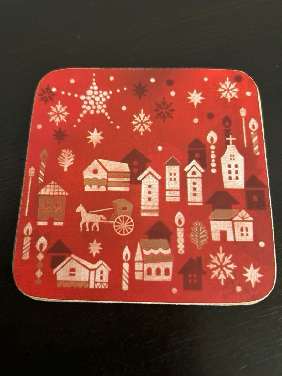 木の素材に紙製シート(上)、コルクシート(下)が貼られたコースター4枚です。