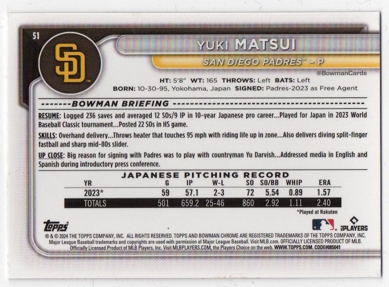 2024 Bowman Chrome #51 Yuki Matsui RC