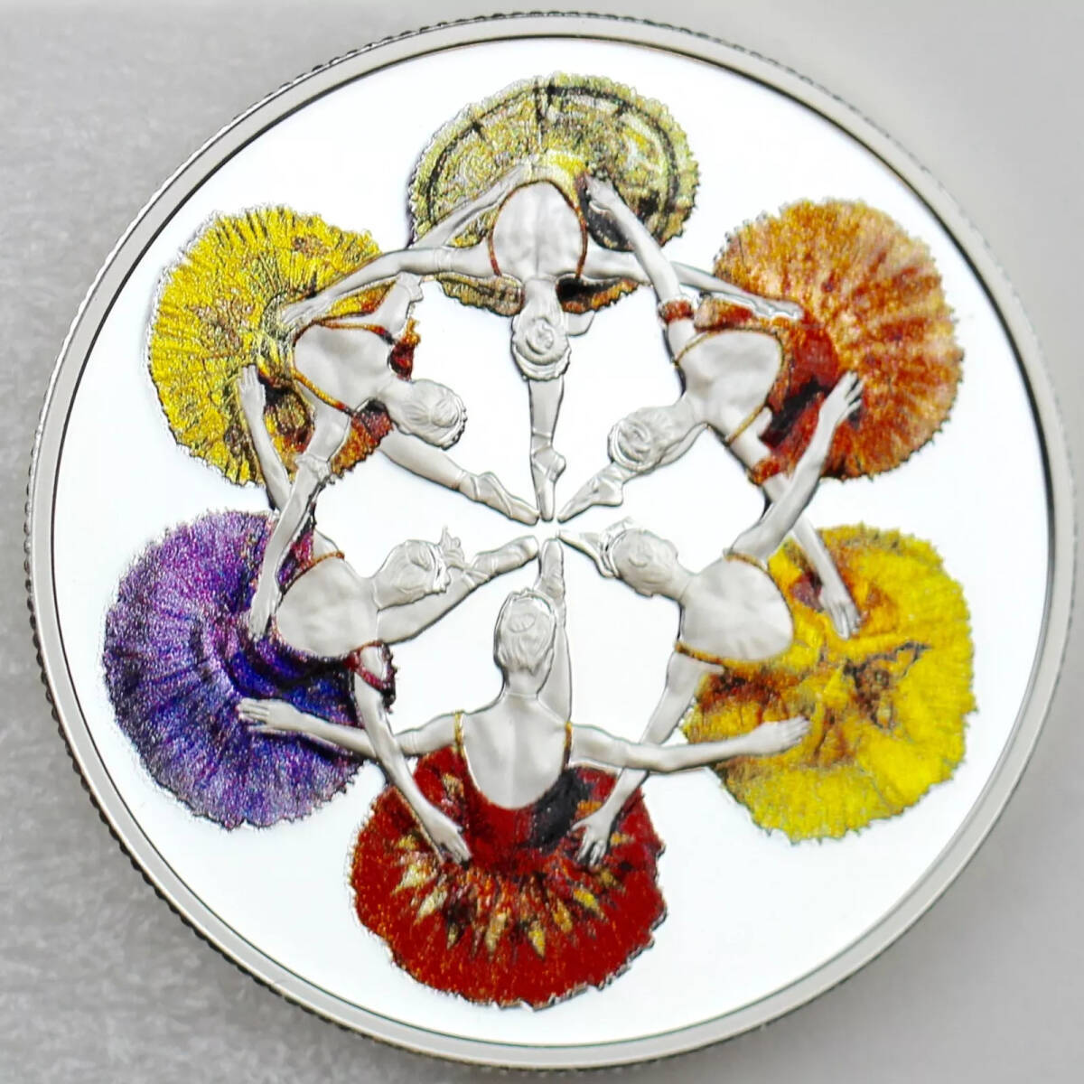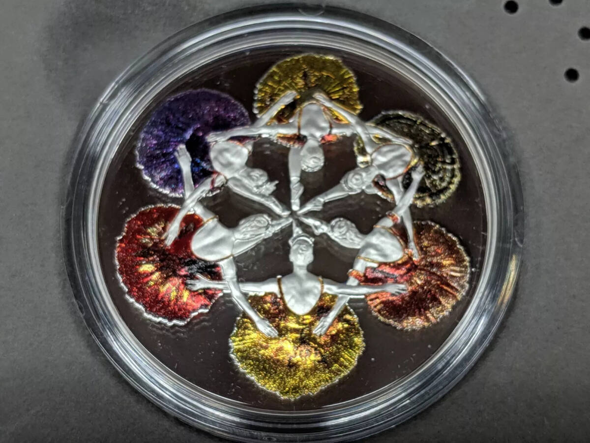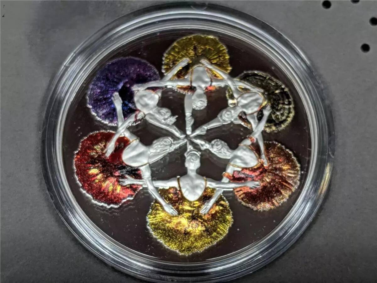 史上初!カナダ王室造幣局限定のこのコインの特徴は、初めて使用された高度な「シアー・エフェクト」彩色技術です!ロイヤル・ウィニペグ・バレエ団のダンサーが「眠れる森の美女」の豪華な舞台で着用した複雑で柔らかな色の衣装を忠実に再現しています。