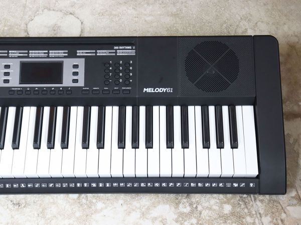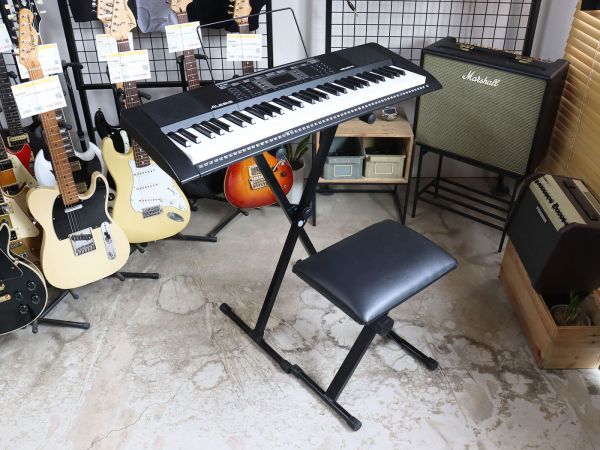 これからキーボードを始める方に最適なオールインワン・ポータブル・キーボードです。 軽いタッチの61鍵キーボード、内蔵スピーカー、200種もの音色、複数の音色を重ねるレイヤー機能や、鍵盤を2つに分割して異なる音色を割り当てるスプリット機能など、簡単な操作で多彩な演奏が可能となっております。 鍵盤以外の樹脂部分に使用に伴うスレなどがございますが、演奏時に気になるようなものはございません。 付属品色々揃っています! 付属品 ....キーボードスタンド、イス、譜面立、マイク、電源アダプタ |