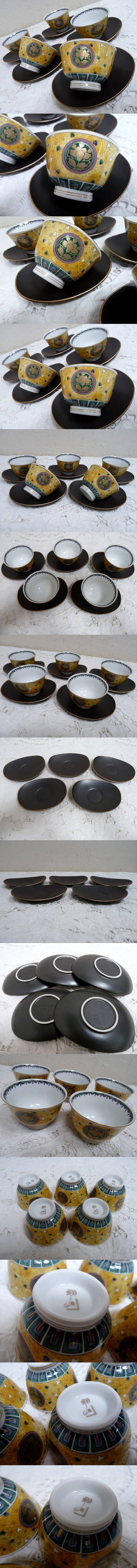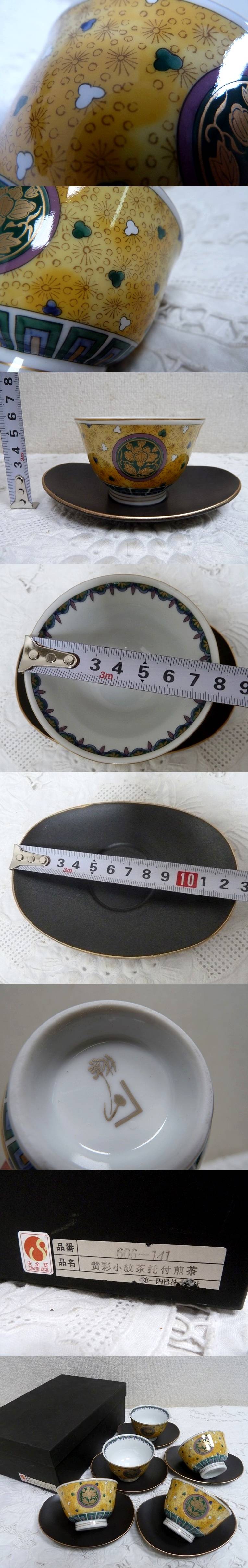 (☆BM)翔山/茶托付き 湯飲み 黄彩小紋/茶器セット 5客 陶器製 140ml 日本 クラッシック おもてなし 煎茶道具 茶碗 金彩 黄色