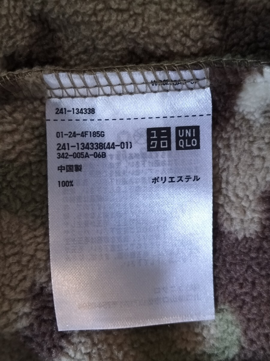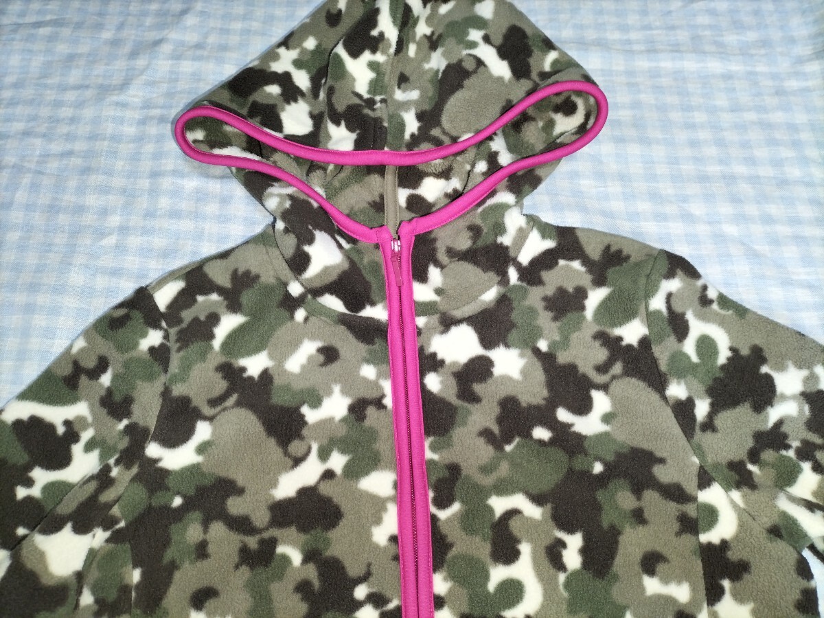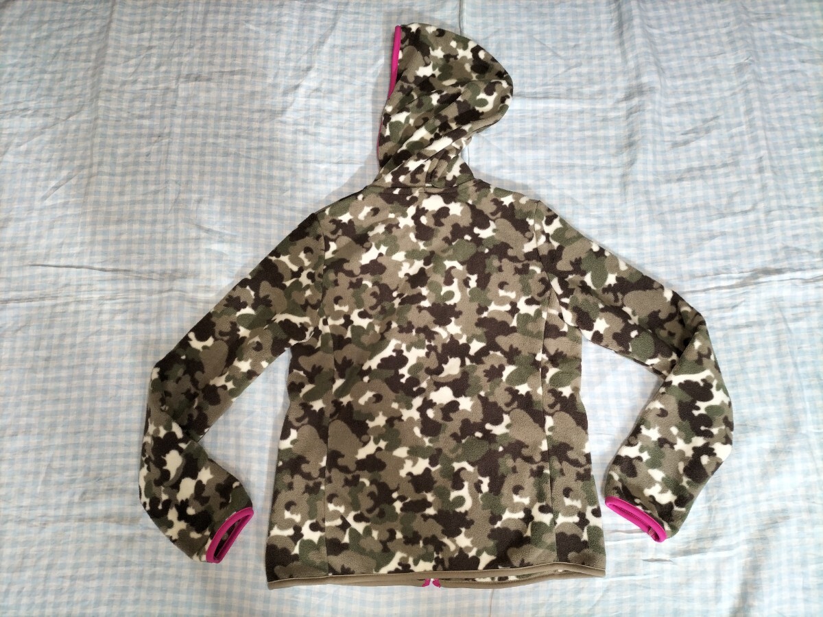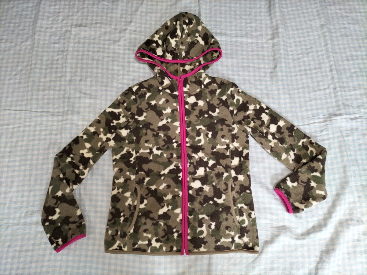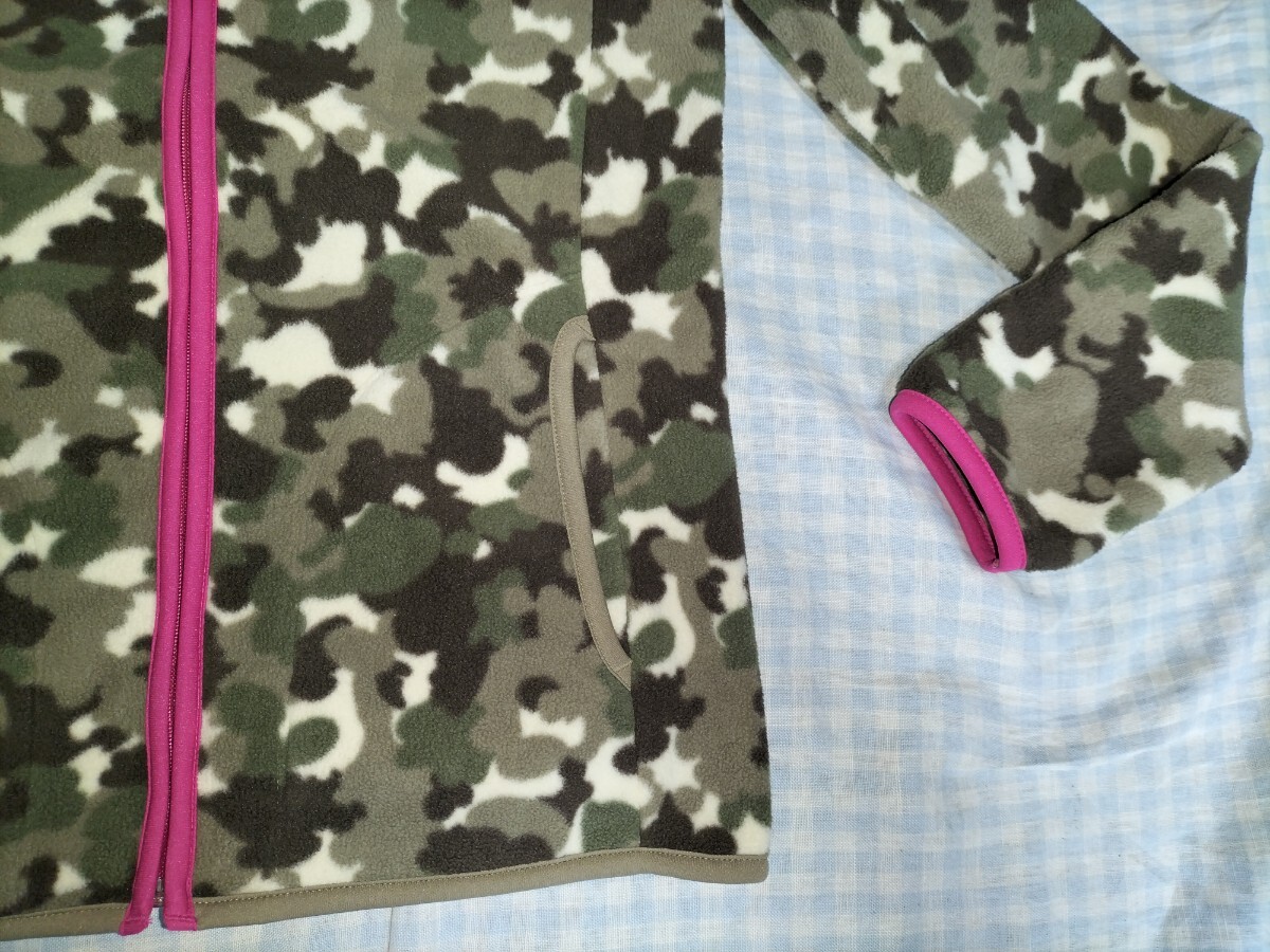 色はカーキや焦げ茶、オフホワイトの迷彩柄 濃いピンクのパイピング 素材はポリエステル100% サイズM 実寸:肩幅35胸幅46袖丈61着丈59 cm