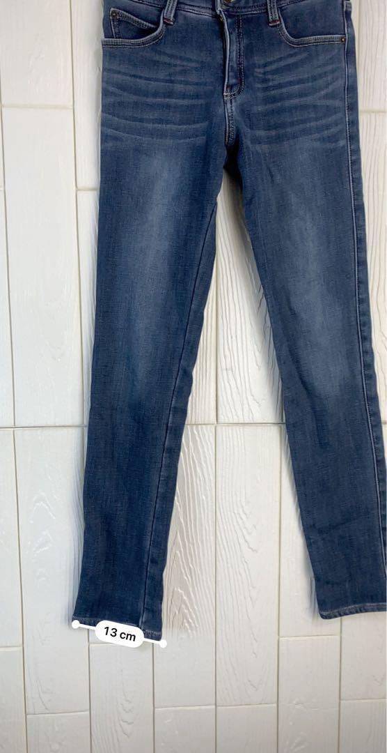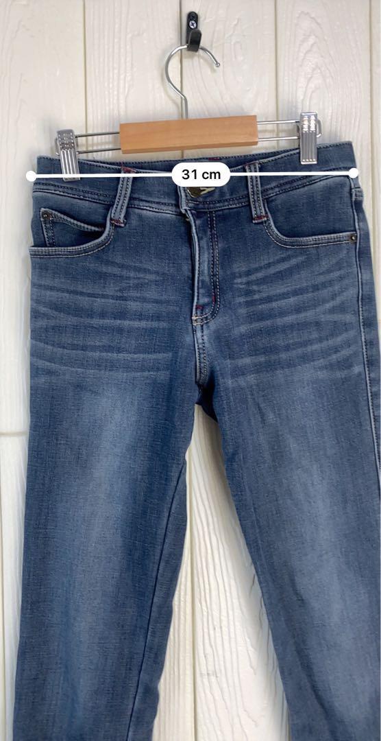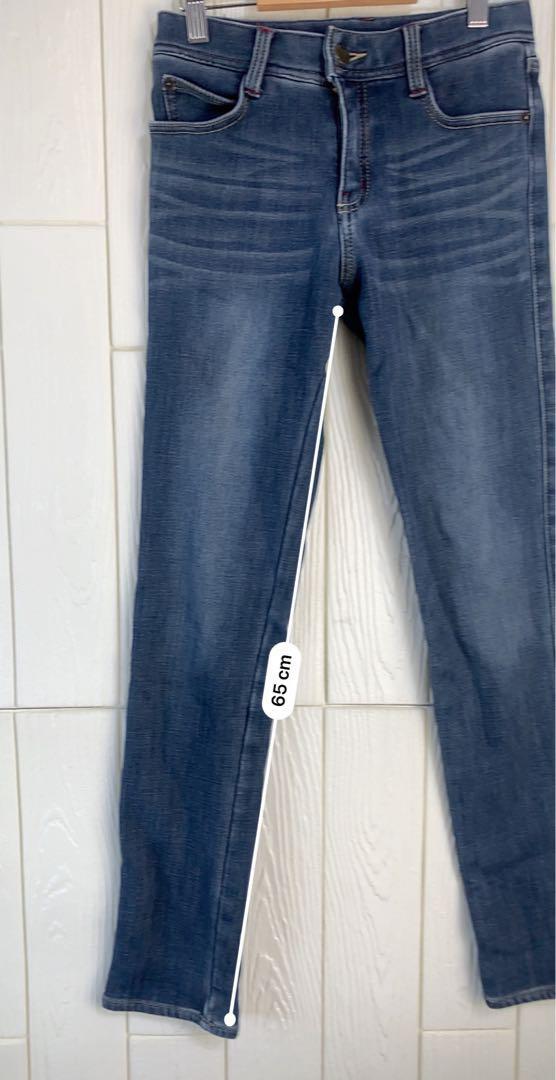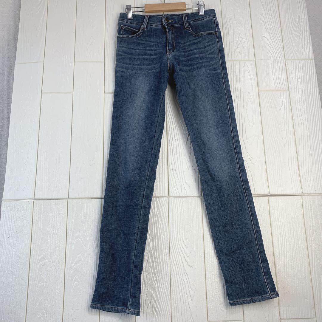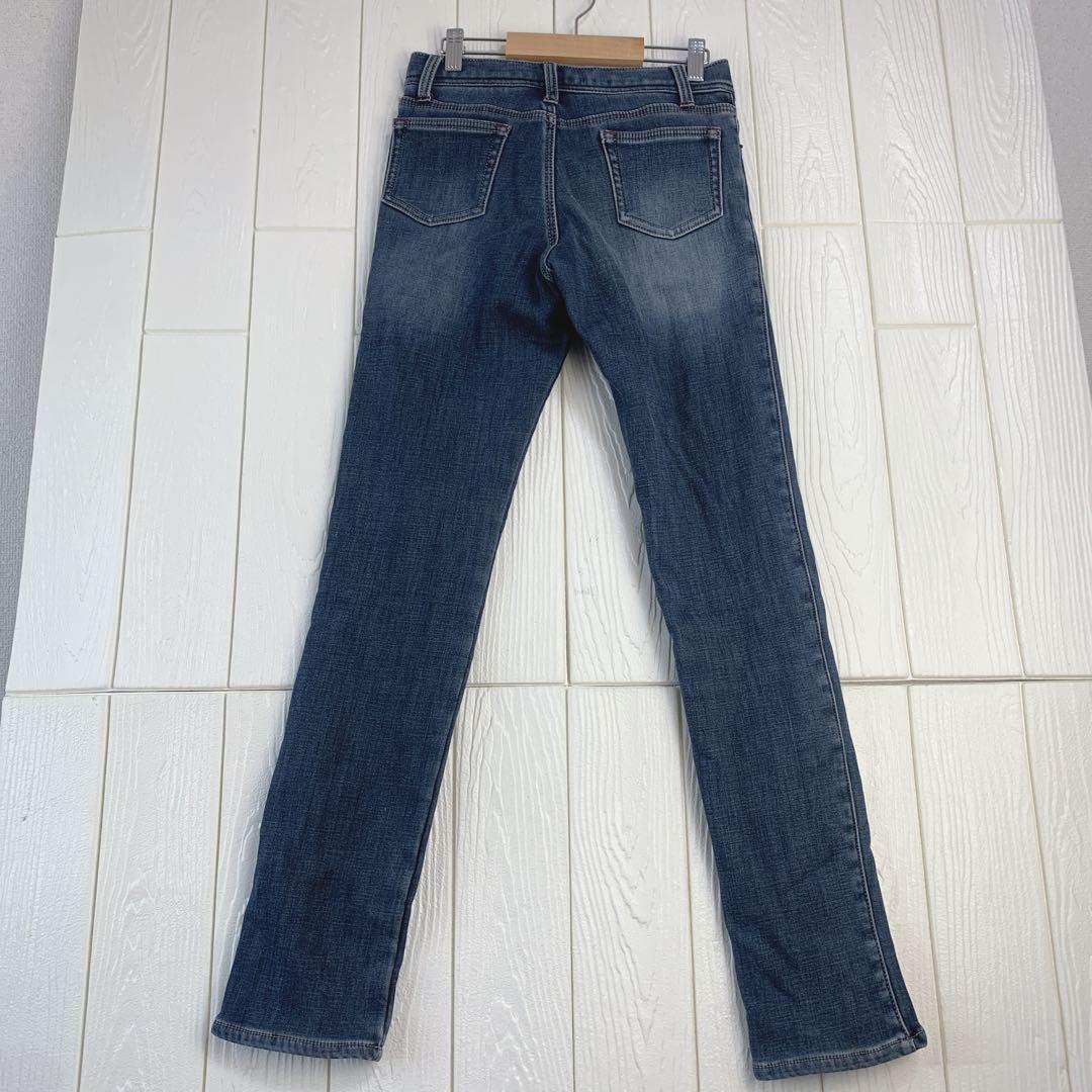 ストレートデザインのデニムパンツ、ウエスト62cm、股下21cm。