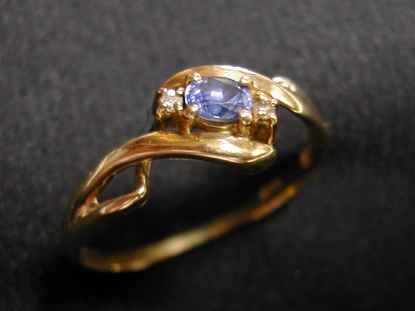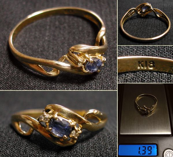 サファイアの中石と脇石2石が付いた18金デザインリングです。