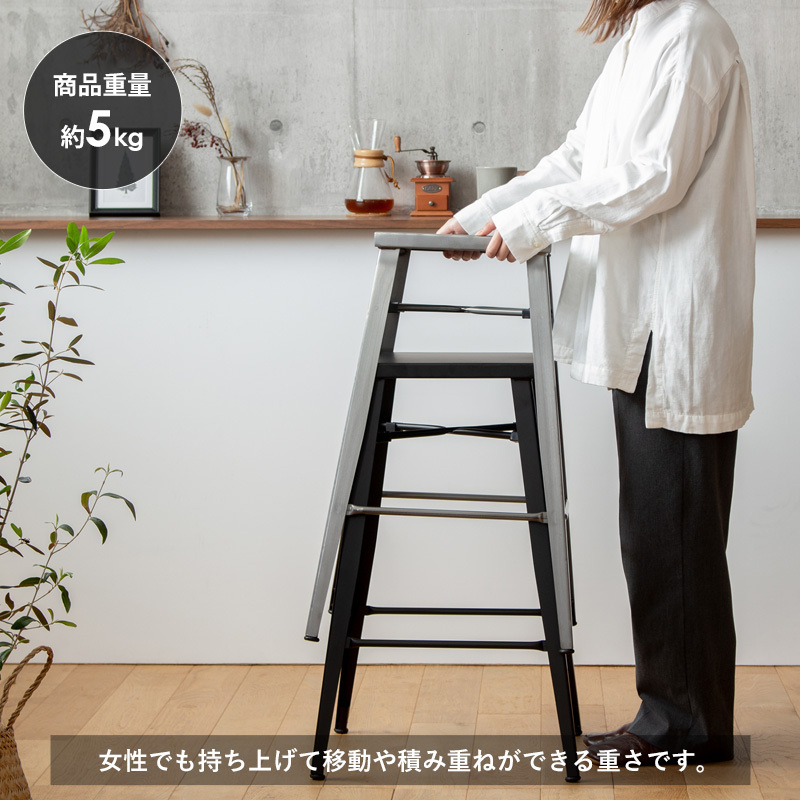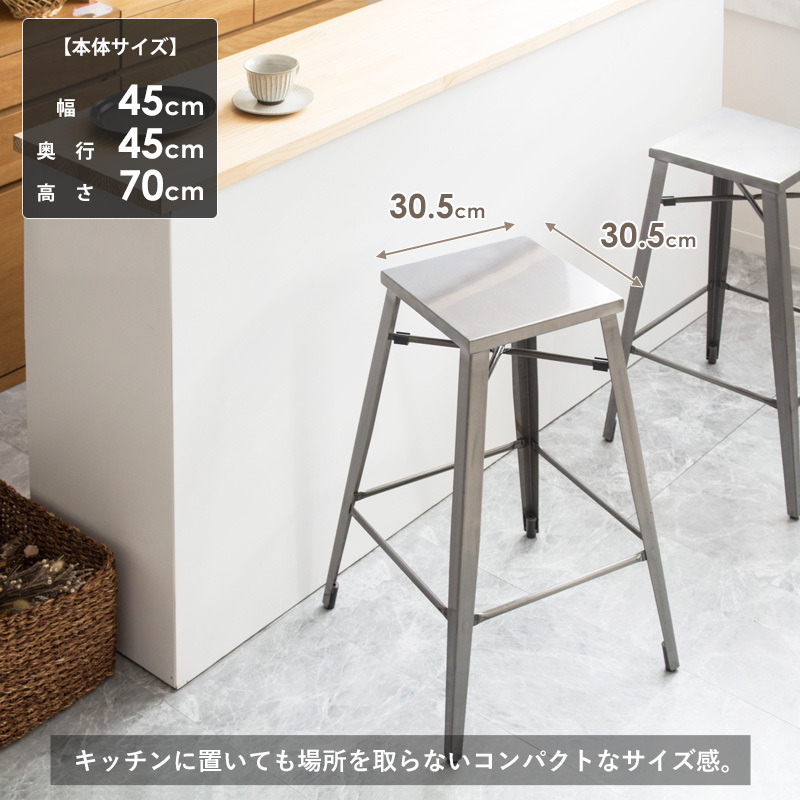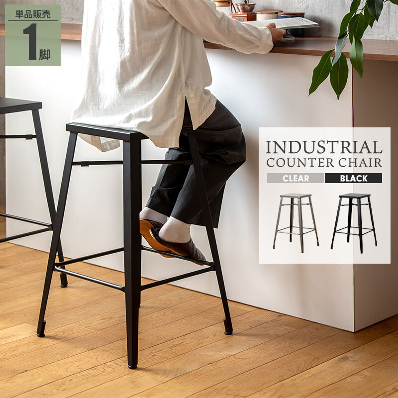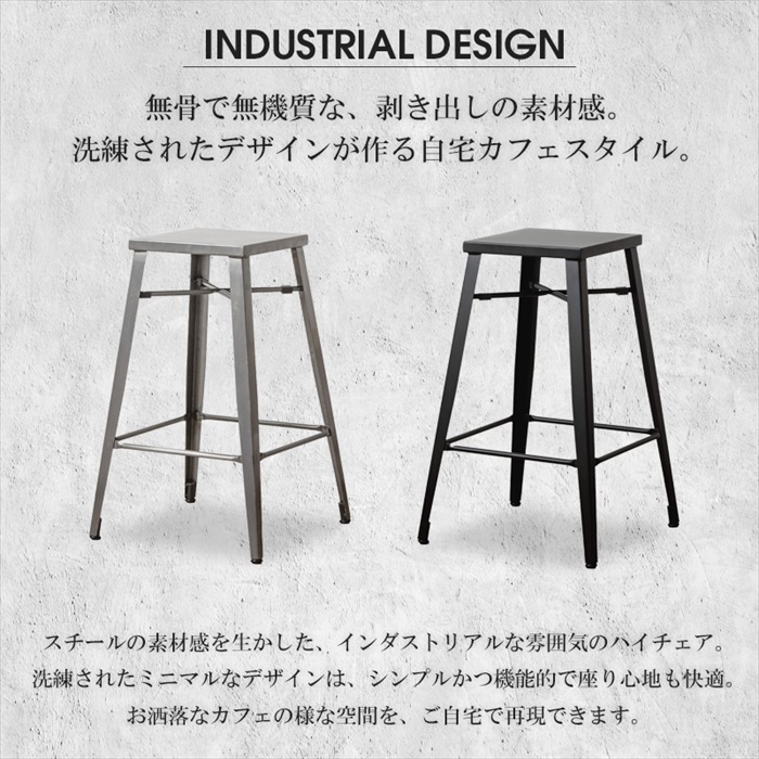 | 金属の質感を生かしたインダスリアルテイストが特徴のカウンターチェア。 剥き出しの素材感を主張しながらも、表面は塗装によりつるりとした手触りで、ハの字に開いた脚部デザインがスタイリッシュな印象。 キッチンカウンターやバーカウンターの椅子として暮らしに溶け込み、ご自宅のキッチン、ダイニングをおしゃれなカフェ風に演出します。 |