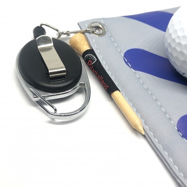 ワイヤーリールによって最長74cmの長さまで伸びるカラビナ(フックとベルト掛けの2WAY)が付いており、キャディバッグ、ラウンドバッグ、スタンドクラブケースなどにつけてラウンドし、手元に引き寄せてさっと利用していただく事が可能です。