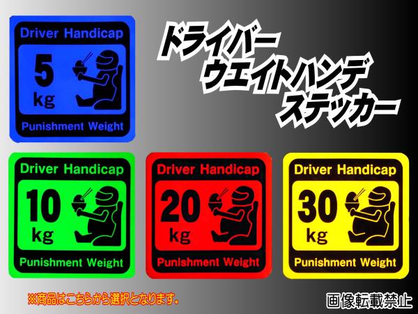 ドライバー ウエイト ハンデステッカー ・ ウエイトハンデステッカーのパロディ版ステッカー各種です。 価格は1枚を選択した場合の価格です。 ※落札後に購入希望種類を確認しております。 ・ ジムカーナ・ダートラ・ラリー・カート・耐久レース等の ウェイト表示・重量表示に使用します。 ・ サイズは各種共に 10cm×10cm 30kg 黄 20kg 赤 10kg 緑 5kg 青 の表記となります。 ・ Punishment=「お仕置き」 の意味です。 食べすぎ表示を丼の量とウエストで表現しています。 走行タイムの言い訳に最高な仕上がりです。 ・ 別途「1000kg」「1t」等の特注仕様について+料金で対応します。 ■その他のステッカー・ドレスアップパーツも こちら で出品しております。 ●免責事項 a 商品に関するお取り付けは自己責任でお願い致します。 b 商品到着後、まず商品及び付属品をご確認いただき、 取付ける前に、仮合わせで十分な確認を行って下さい。 いかなる理由があっても、取付及び取外工賃などの費用は負担しかねます。 法律上の請求の原因の種類を問わずいかなる場合においても、 商品の使用または使用不能から生ずる人災、災害、業務外または、 業務上の利益損失損害、当方は一切の責任を負わないものとします。 ◆ その他の要望や問い合わせは コチラ まで。 |