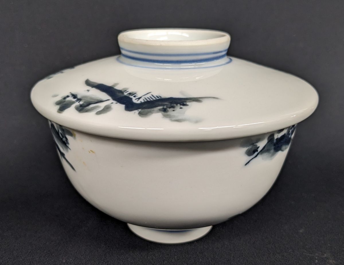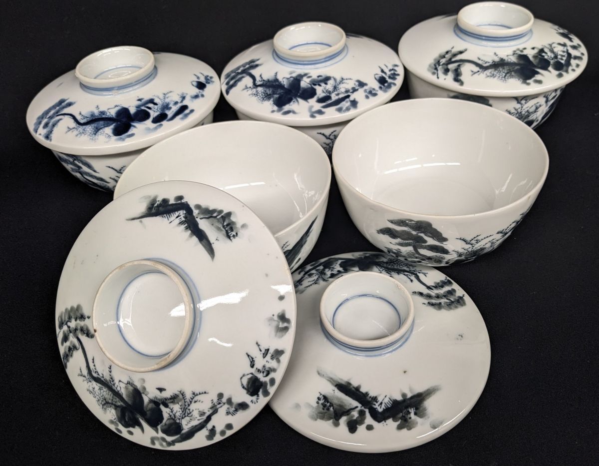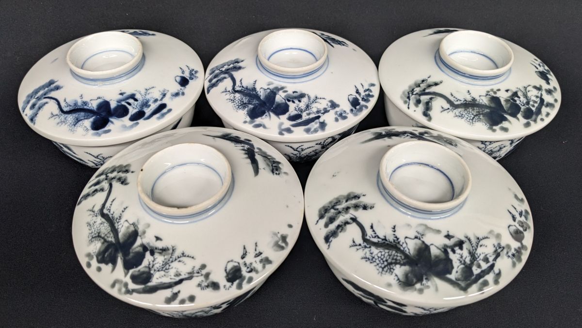 aa873● 伊万里染付松灯篭文蒸茶碗五客揃 蓋茶碗 懐石碗 古美術 民藝 骨董 レトロ アンティーク/80