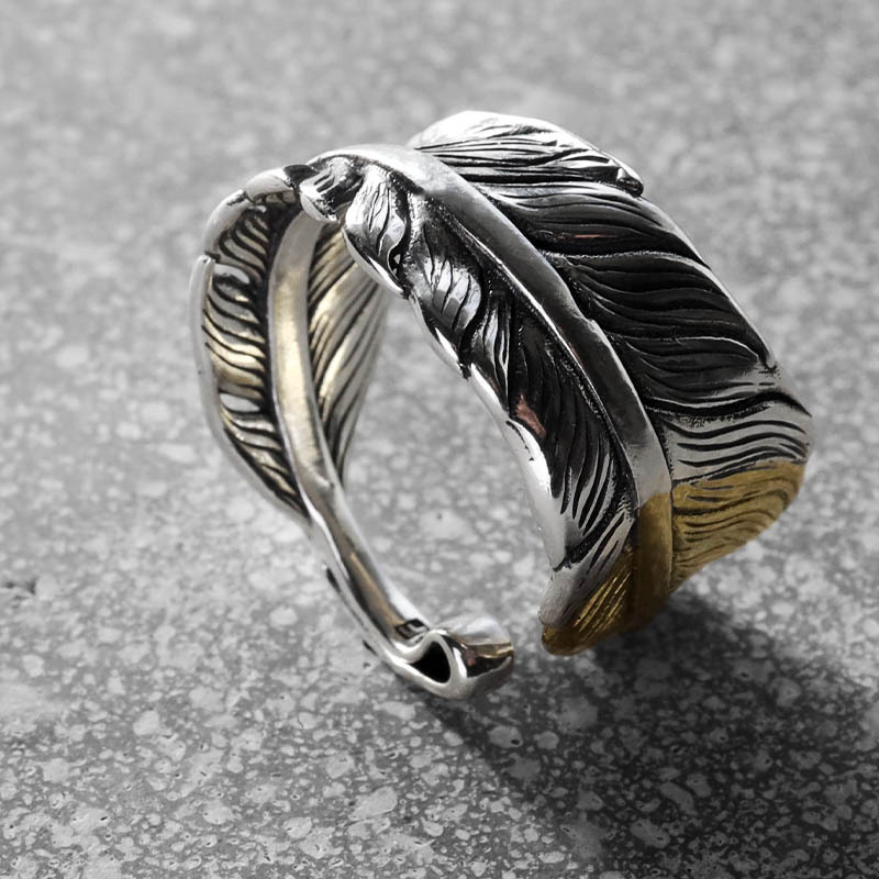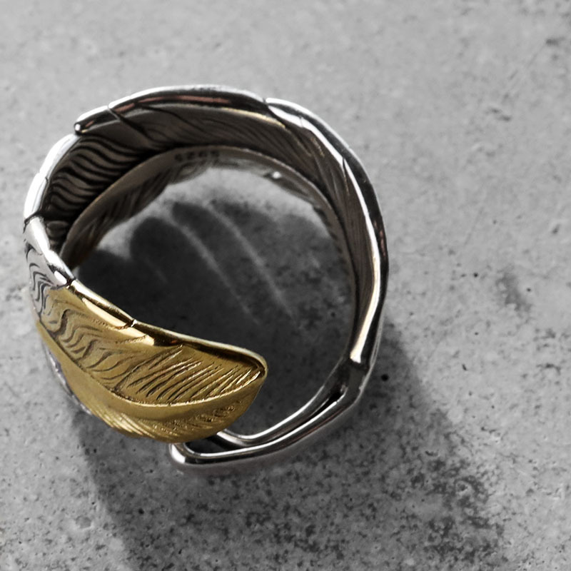 本体に使用しているシルバー925が味のある輝きを放つ指輪です。先金タイプのフェザーを使用し、ユニークで躍動感溢れる仕上がり。