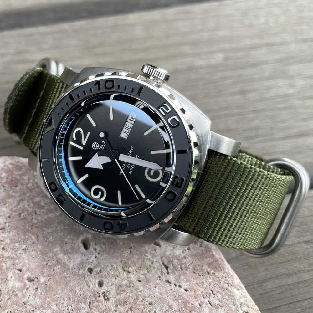 | ■構成パーツ(写真) ・ケース:LVHT010 ・ケースバック:非売品 ・リューズ:COIN-SLIM ・風防:G003/ブルーARコーティング ・ベゼル:007-04 ・ベゼルインサート:3bq-wtdbk ・チャプターリング:ブラック/ホワイト(※パーツのみ非売品) ・ダイアル:ARF(非売品) ・針:hd-a44 ・ムーブメント:SEIKOウォッチ NH36A ■商品スペック ・ムーブメント:自動巻き/セイコー(SII) NH36A Japan Movement ・ケース:316Lサージカルステンレス/直径約42MM(約45mm リューズを含む) ・リューズサイズ:直径約7.5mm ・ダイアルカラー:マットブラック ・ベルト:ZULUナイロンベルト ・風防:サファイアクリスタル(無反射/3層、ARブルーコーティング)/トップハット ・ベゼル:316ステンレス/120 Clicks ・ベゼルインサート:セラミック ・チャプターリング:ブラック&ホワイトマーカー ・蓄光:luminous C3(インデックス、針) ・防水性:20気圧防水 ・製造:日本製、自社(川越市)組み立て ・保証:1年保証 ・付属品:専用BOX、説明書 ・備考:正規品/シリアル番号の指定は出来ません。 |