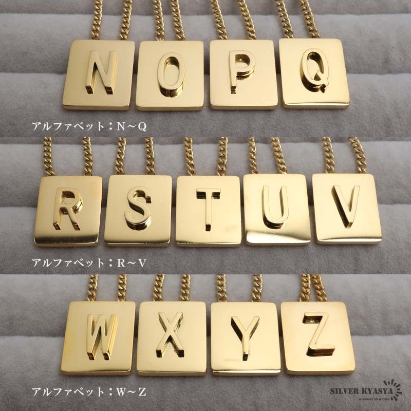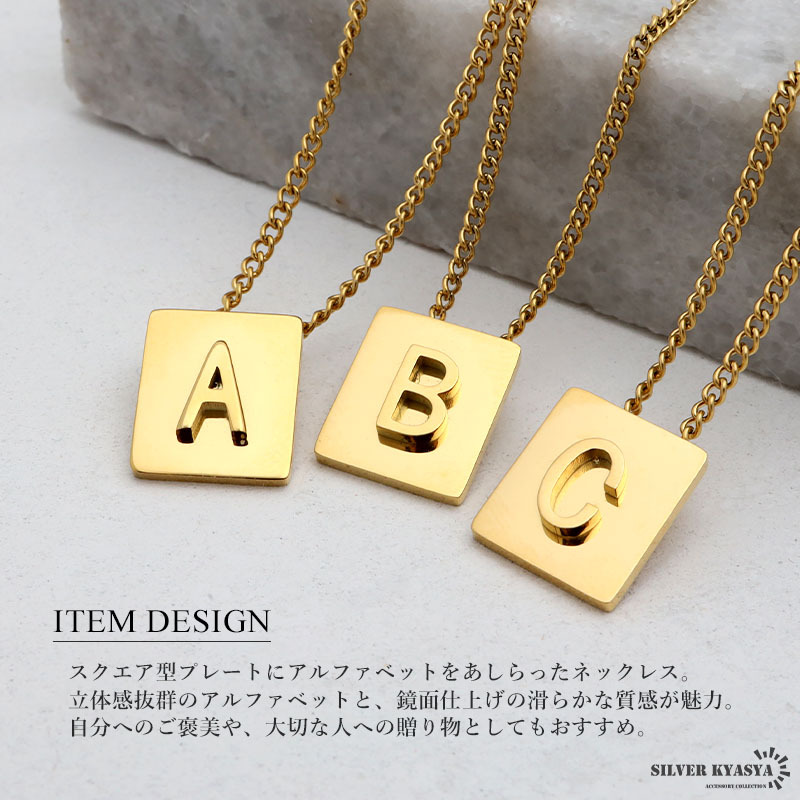 スクエア型プレートにアルファベットをあしらったネックレス。立体感抜群のアルファベットと、鏡面仕上げの滑らかな質感が魅力。自分へのご褒美や、大切な人への贈り物としてもおすすめ。