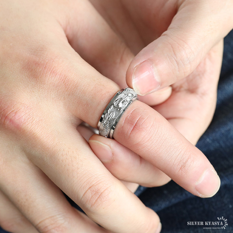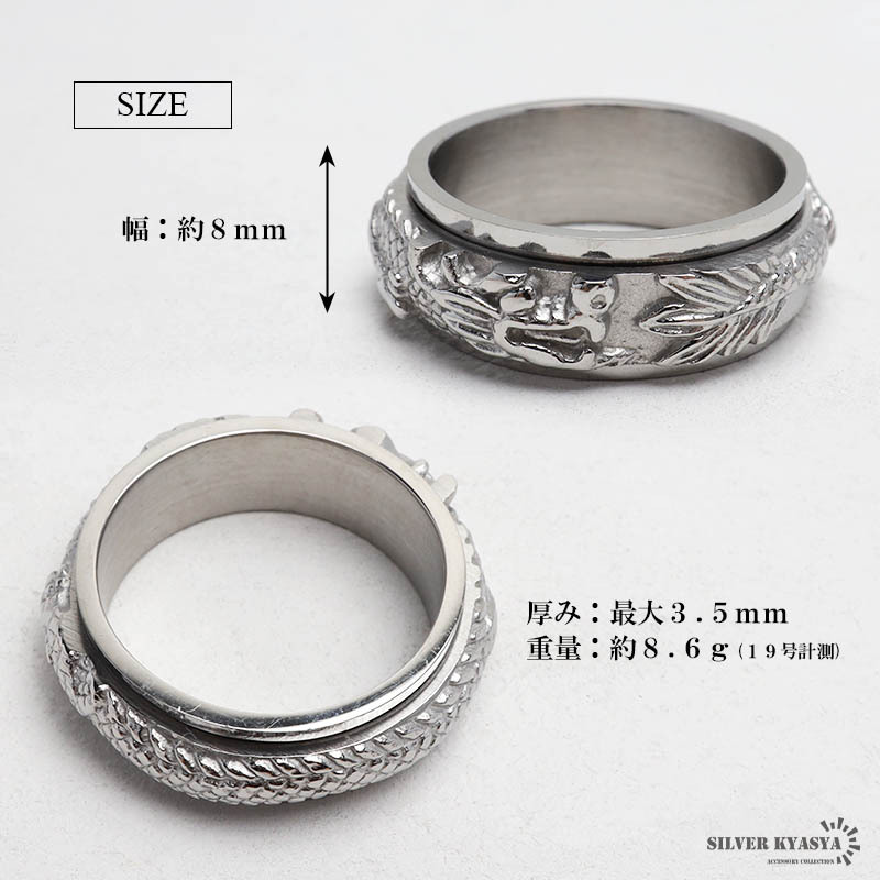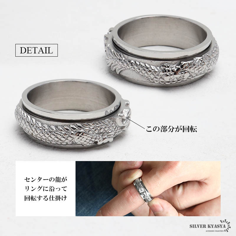 | 商品概要 | ■個性が光るギミック センターが回転するギミックを搭載。躍動感がある龍モチーフのステンレス製リング。二重構造で重厚感のある仕上がり。 ■ステンレス素材を使用 金属部分は頑丈なことで知られるステンレス素材を採用。耐久性はもちろん耐水性も高く水場での着用も可能。金属アレルギーも出にくいとされている金属です。 |