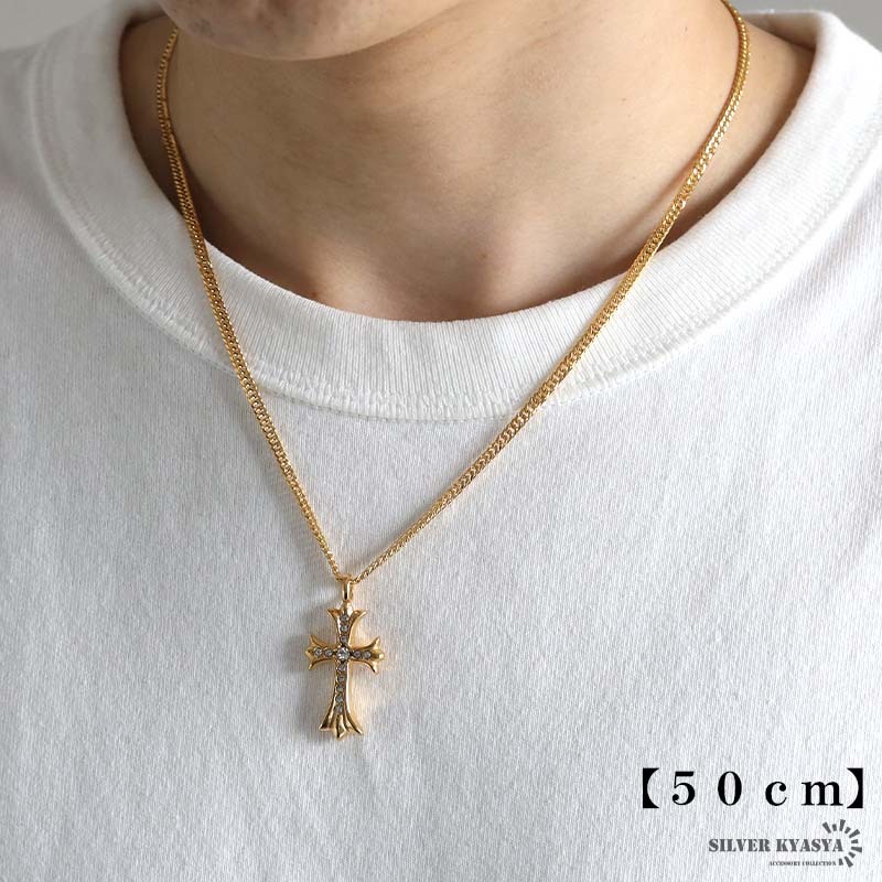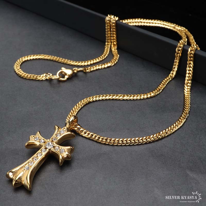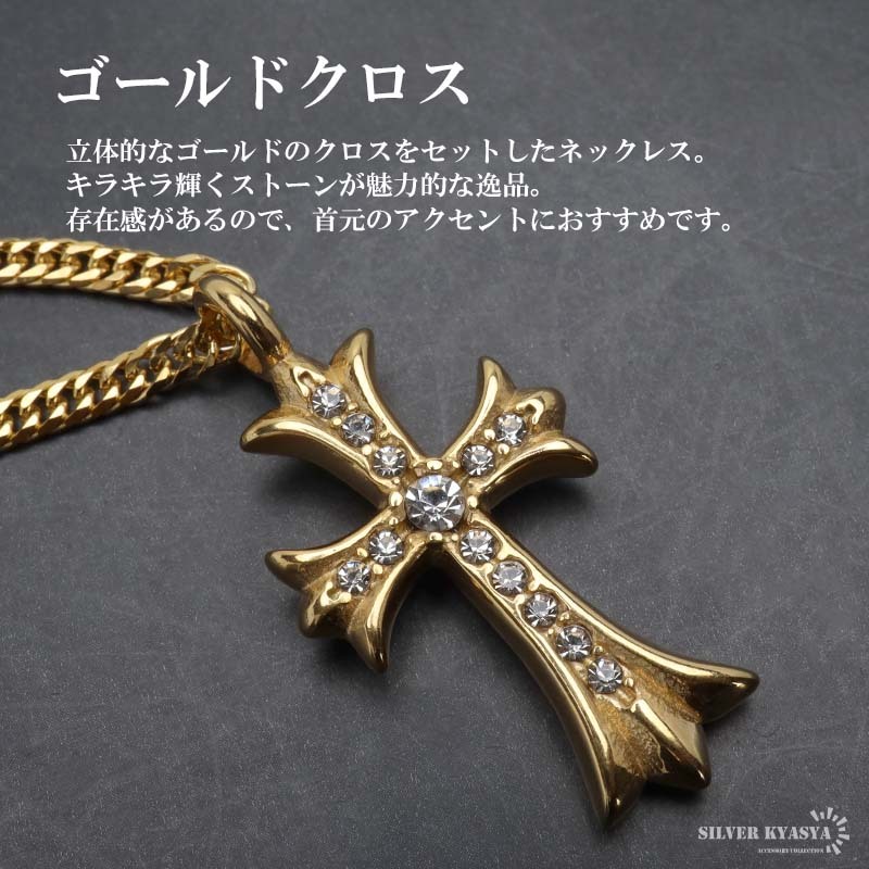 立体的なゴールドのクロスをセットしたネックレス。キラキラ輝くストーンが魅力的な逸品。存在感があるので、首元のアクセントにおすすめです。