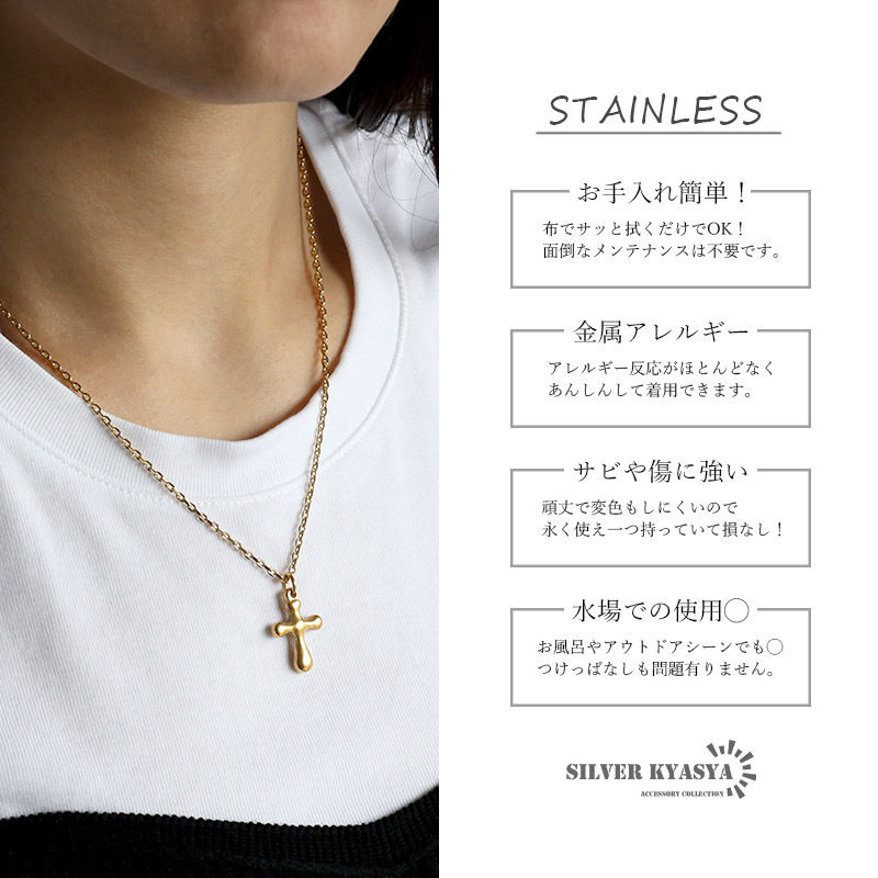| 商品概要 | ■ITEM DETAIL ぷっくりとしたフォルムが可愛いクロスネックレス。4面カットを施したあずきチェーンが光を反射させ、華やかに輝きます。 ■ステンレス素材を使用 金属部分は頑丈なことで知られるステンレス素材を採用。耐久性はもちろん耐水性も高く水場での着用も可能。金属アレルギーも出にくいとされている金属です。 |
