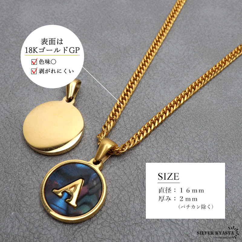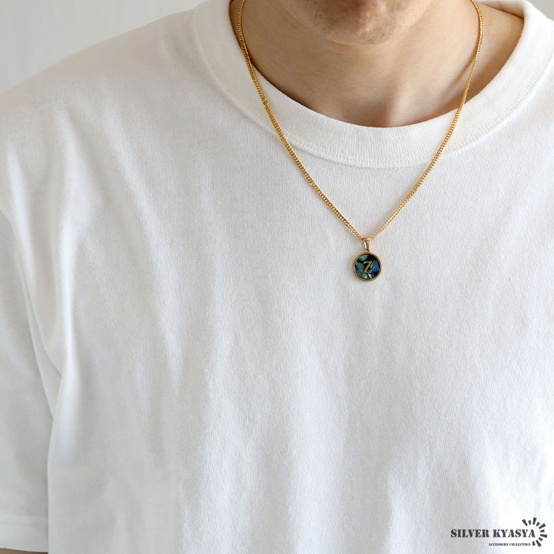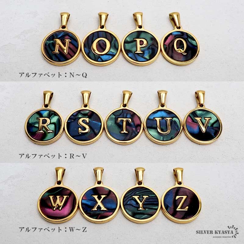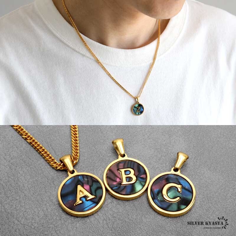 ラウンド型プレートにアルファベットをあしらったネックレス。オーロラのような美しい色彩にゴールドが映えるアイテムです。自分へのご褒美や、大切な人への贈り物にもおすすめの一品。