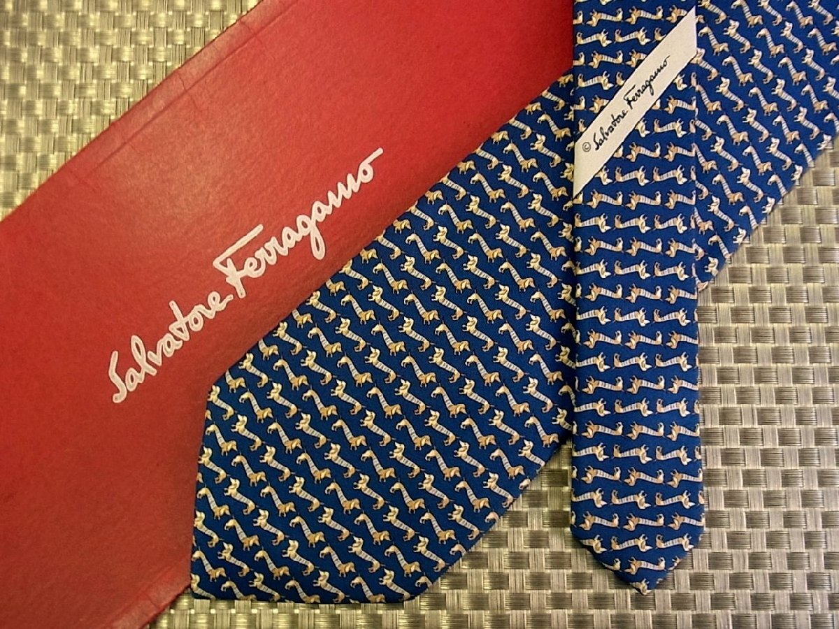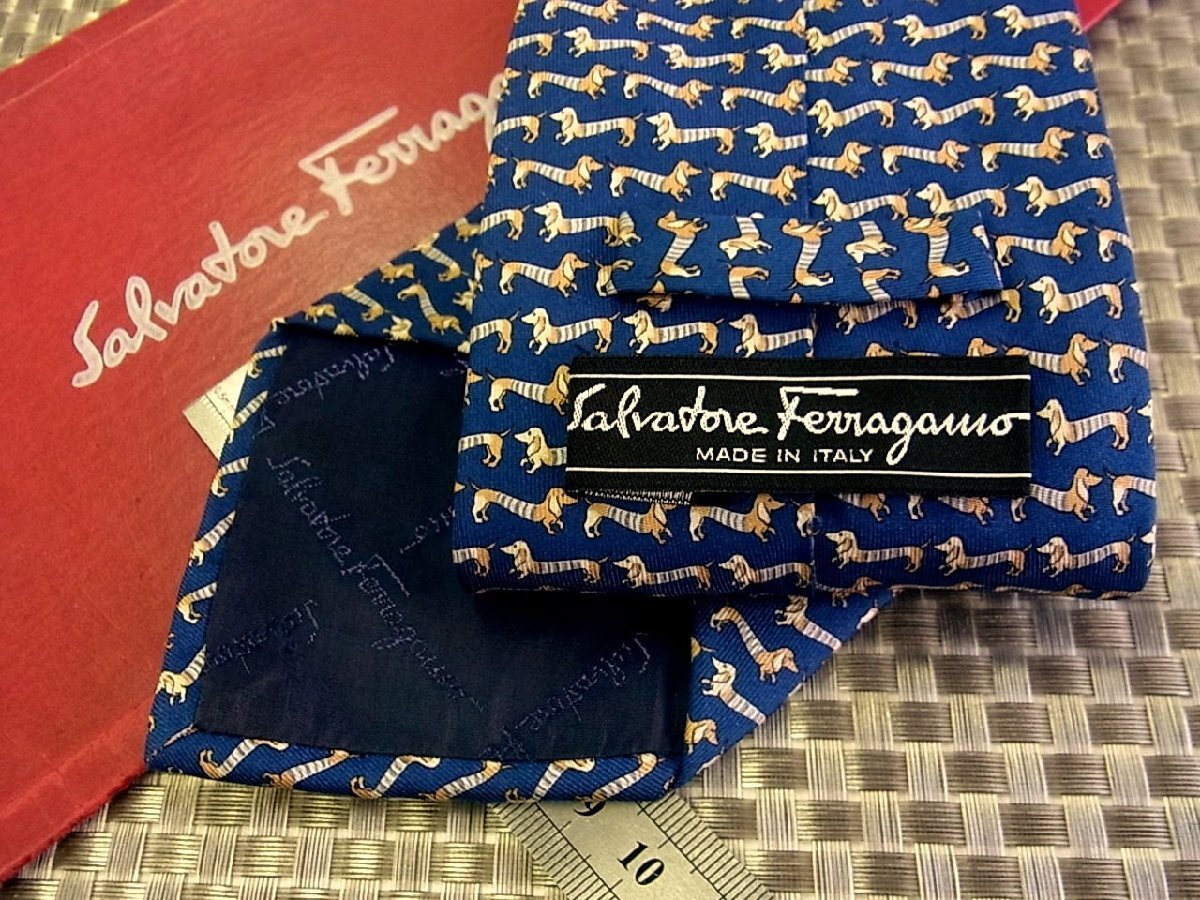 ♪36607D♪状態並品【犬 ダックスフント 動物 柄】フェラガモ【FERRAGAMO】ネクタイ