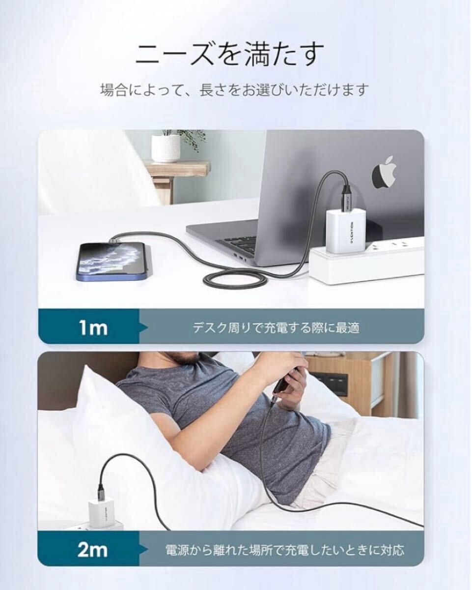 【優れた耐久性】高品質TPE素材とアルミ合金端子を採用しており、耐摩耗性・耐熱性に優れ、劣化や断線を有効に防止できます。約5kgの重さを持ち上げられるほどに耐久性を向上させ、長年にわたりご愛用頂けます。最新のAppleチップは安全で安定した電圧を提供できます。