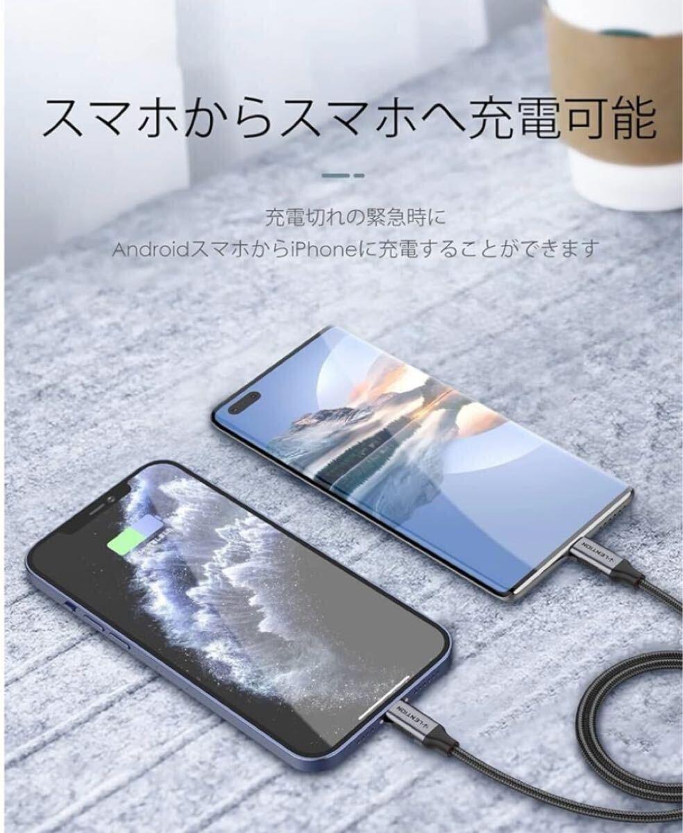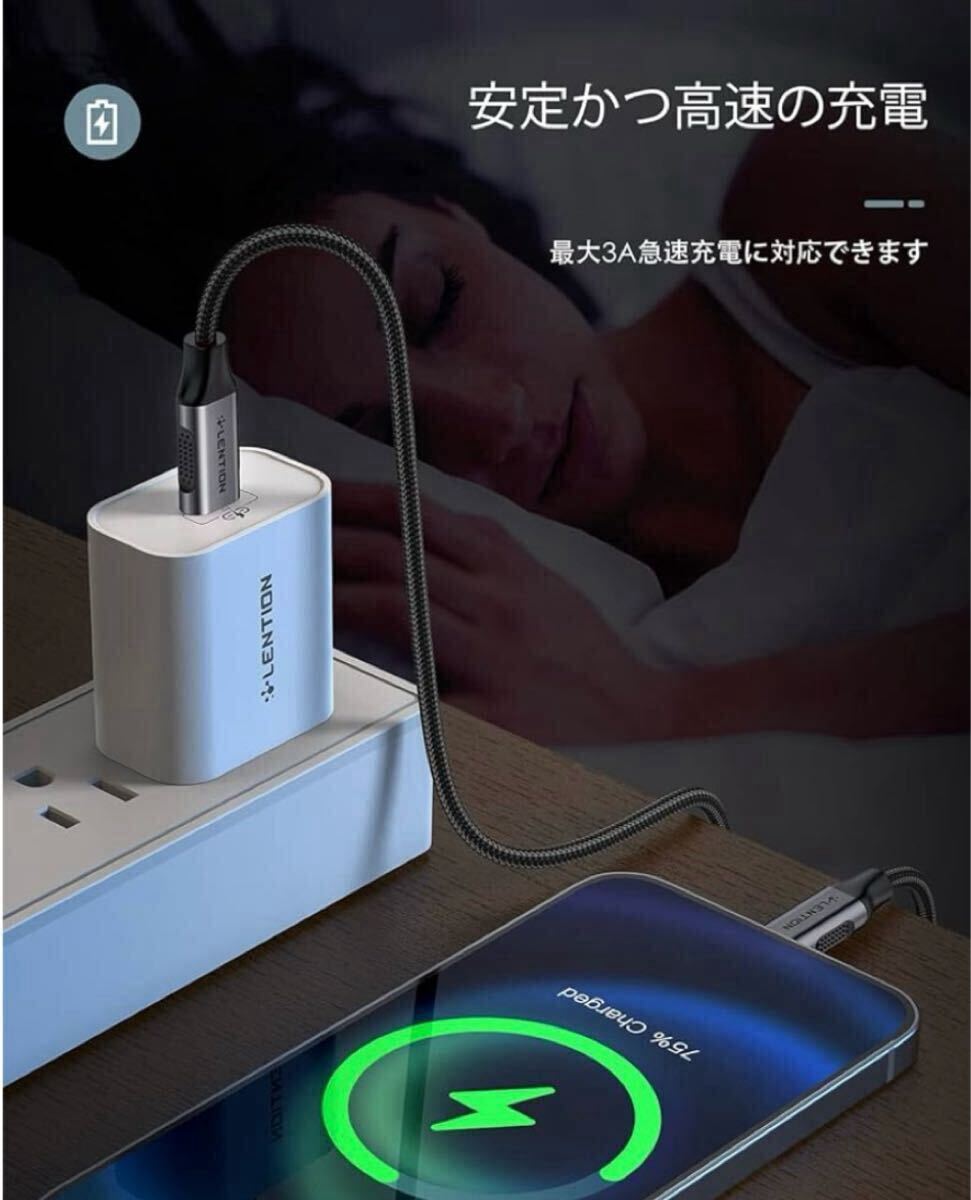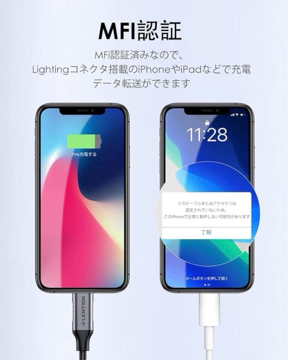 【Apple MFi 認証】Apple社のMFi認証を取得しており、Lightingコネクタ搭載のiPhoneやiPadなどで充電・データ転送ができ、安心してご使用頂けます。(アップル社公式サイトの「MFi Licensed Accessories」にアクセスして認証モデル「1M 213820-232025、2M 213820-373666」を入力すると調査できます)。