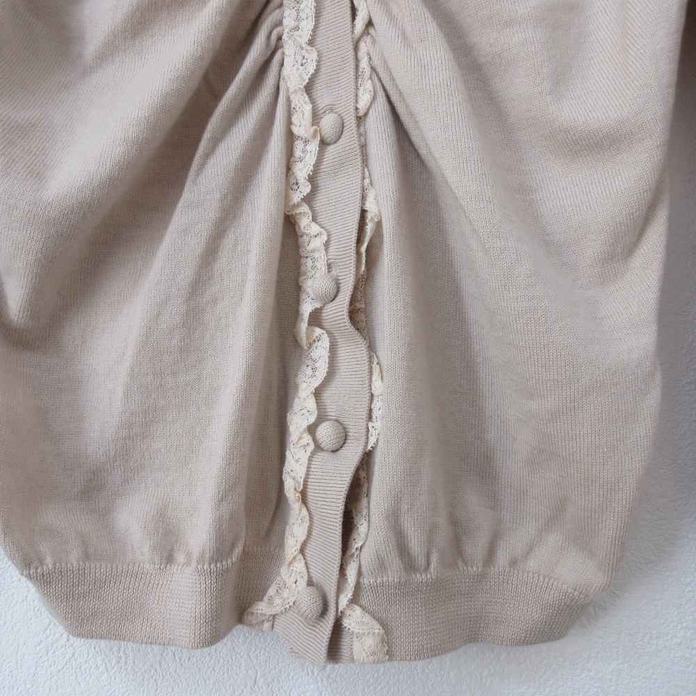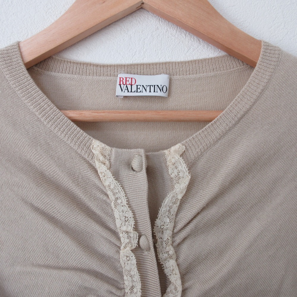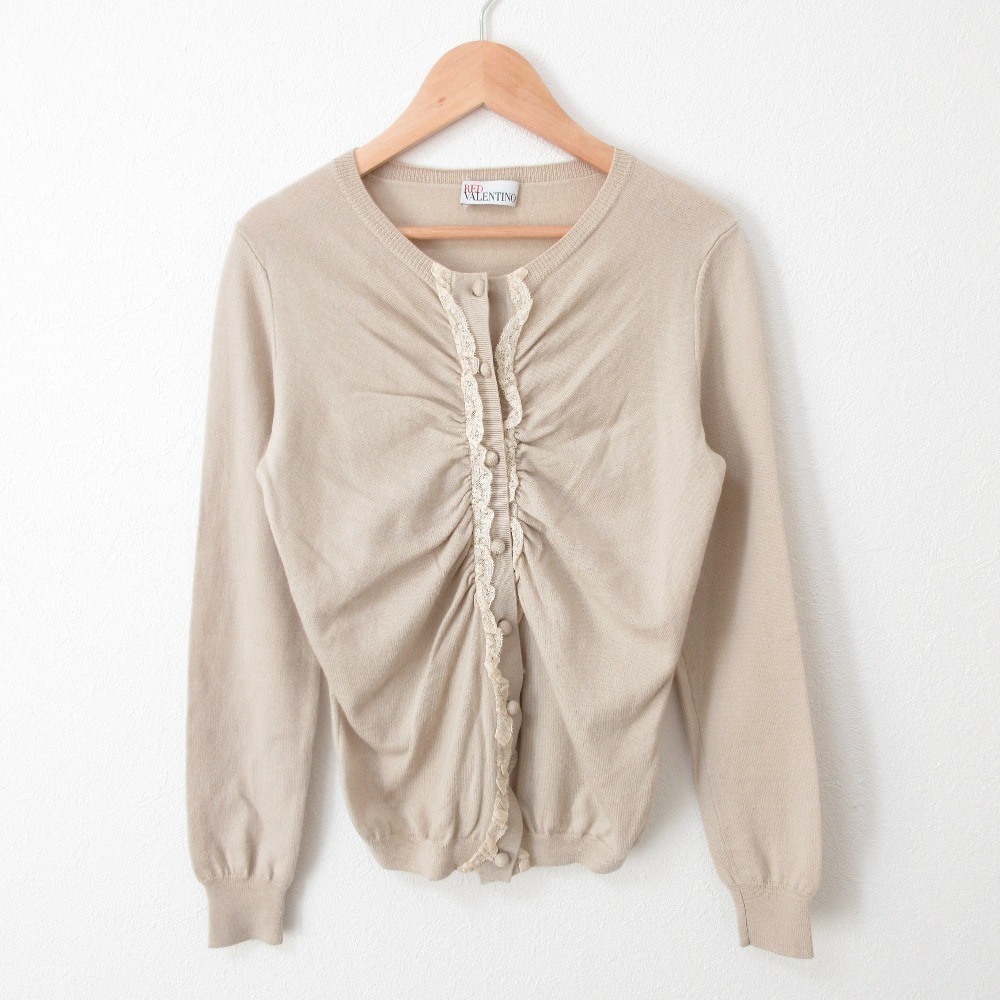商品名:美品 REDValentino レッドヴァレンティノ ウール フロントレース ギャザー くるみ釦 クルーネック 長袖 ニット カーディガン M ベージュ