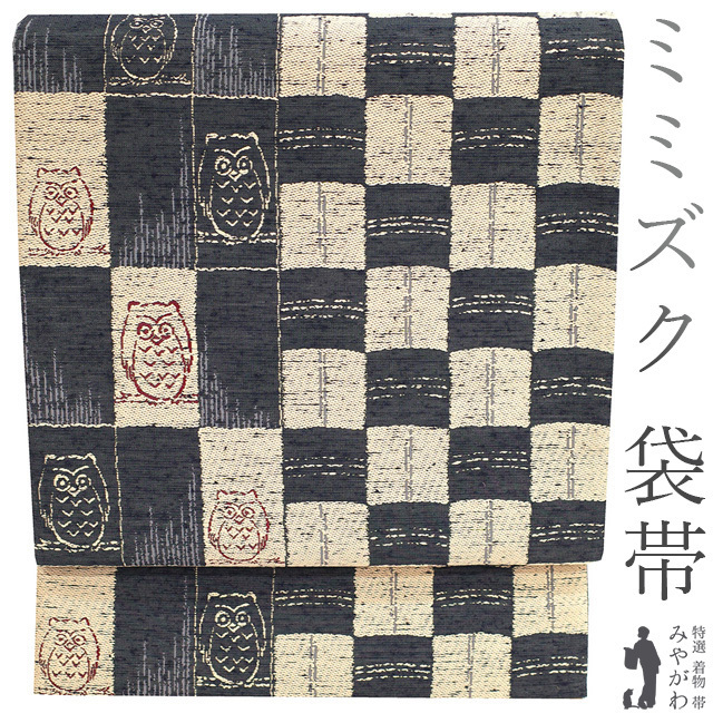 袋帯 京都 西陣 正絹 濃グレー ベージュ ミミズク 鳥 市松 さが美扱い ガード加工済み カジュアル 新古品 仕立て上がり みやがわ sb52072