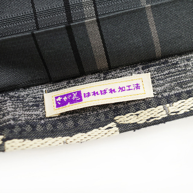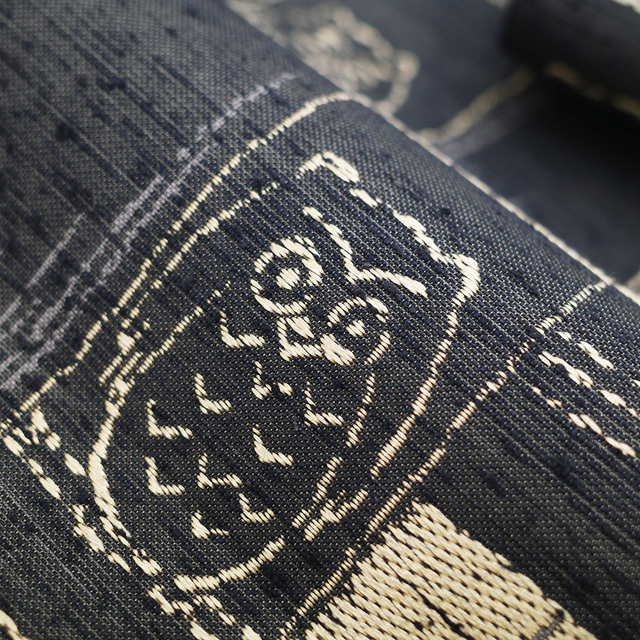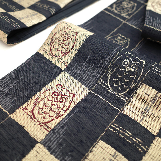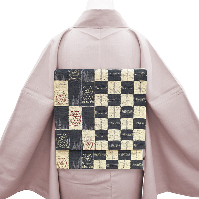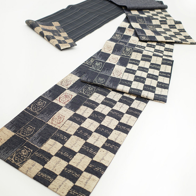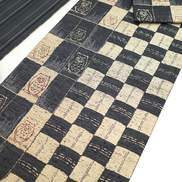 こちらのお品は、濃グレー×ベージュで市松にミミズクが織り上げられています。