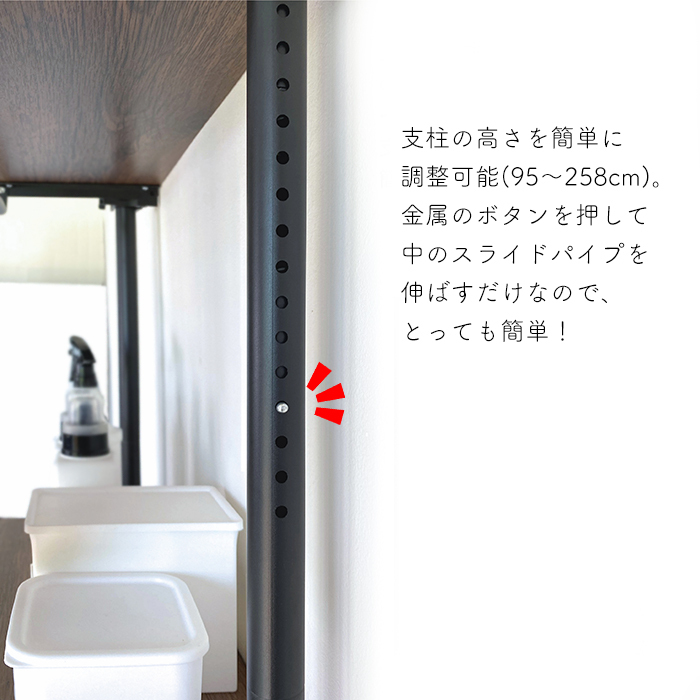 支柱の長さの調整は、金属のボタンを押して中のスライドパイプを伸ばすだけ!支柱の長さの調整がとても簡単です。