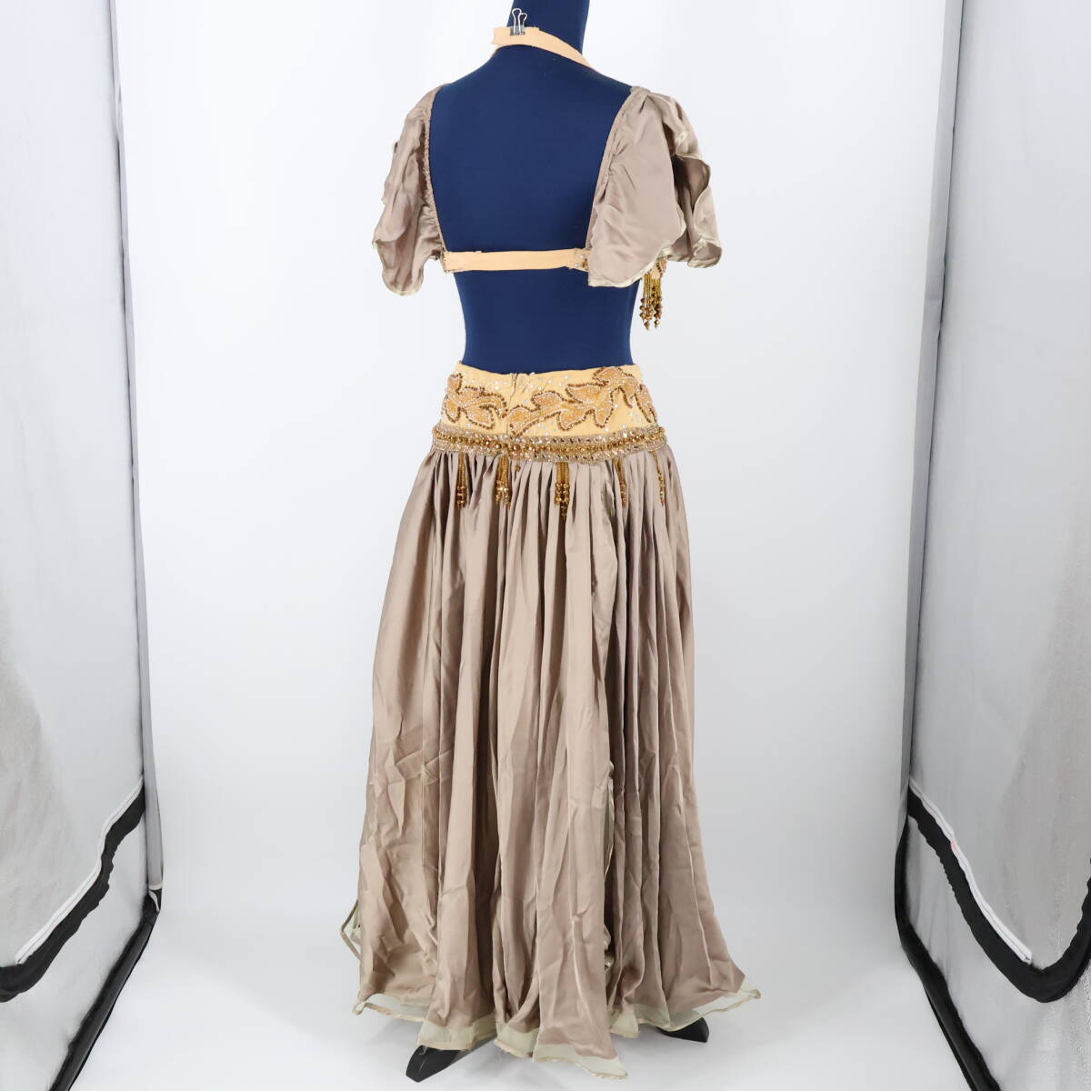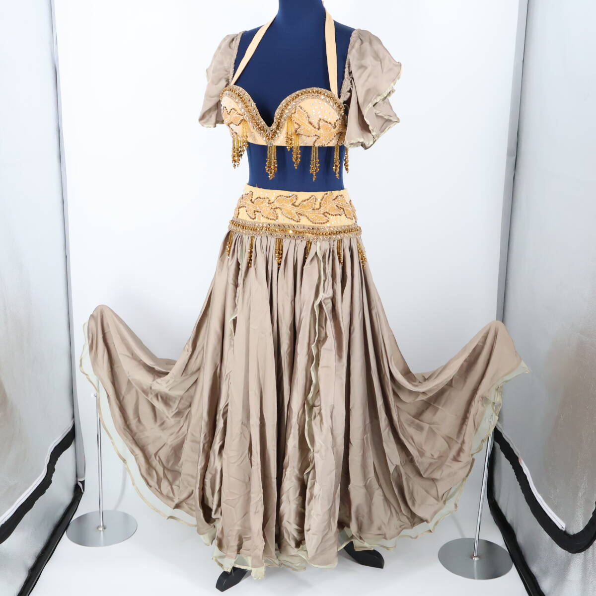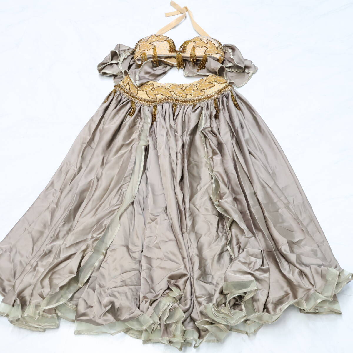 | 商品説明 | 【商品名】ベリーダンス オリエンタル衣装 ブラトップ 【サイズ】 平置き実測:パッド両端長さ約31cm、ネックストラップ右約34cm左約33cm、 アンダーストラップ全長約80cm、アンダーストラップ(ブラ部分を除く)右約27cm 左約22cm ※実測の為、多少の誤差はご容赦願います。 【仕様】 ・アンダーストラップ伸縮性有り スカート 【サイズ】 平置き実測:総丈約87cm、ウエスト約30cm~、スリット約63cm ※実測の為、多少の誤差はご容赦願います。 【仕様】 ・ウエストゴム、ファスナー仕様 ・伸縮性有り ・スリット4ヶ所有り ------------------------------------ 【ポイント】 ▽薄茶色×ベージュ ▽ラインストーン×ビーズが豪華で煌びやか ▽ブラトップ スカートセット ------------------------------------ 【撮影時使用トルソー:女性用トルソー9号(一般的に使用されるサイズです)】 トルソーサイズ詳細 肩幅約37cm、バスト約88cm、ウエスト約66cm、ヒップ約89cm |