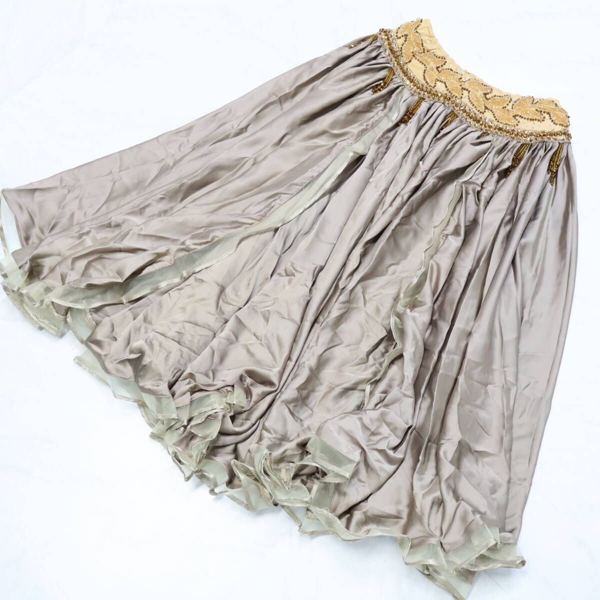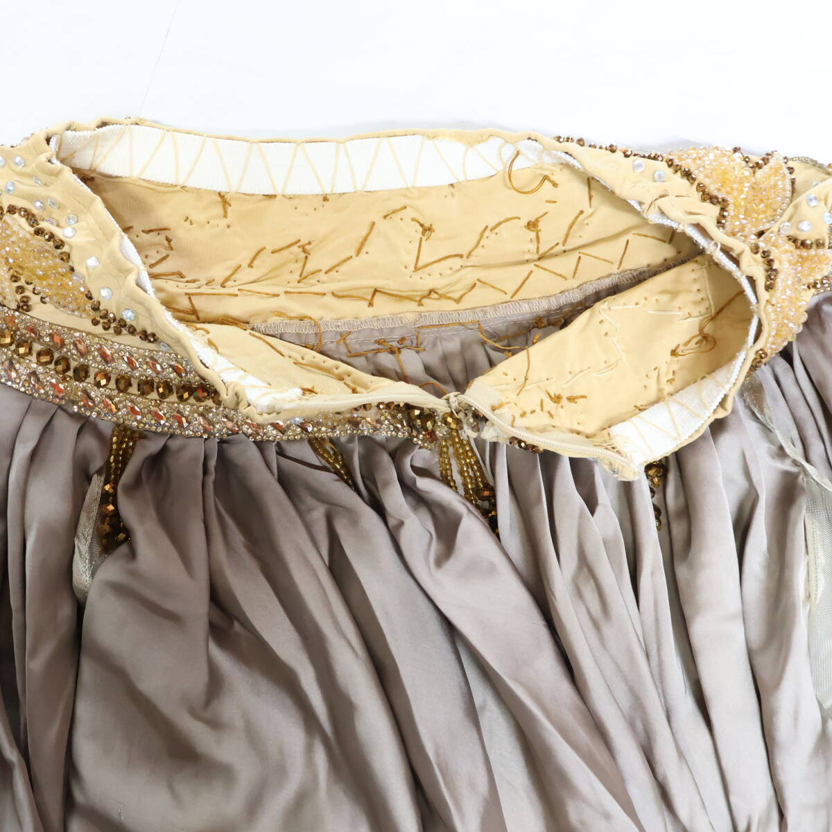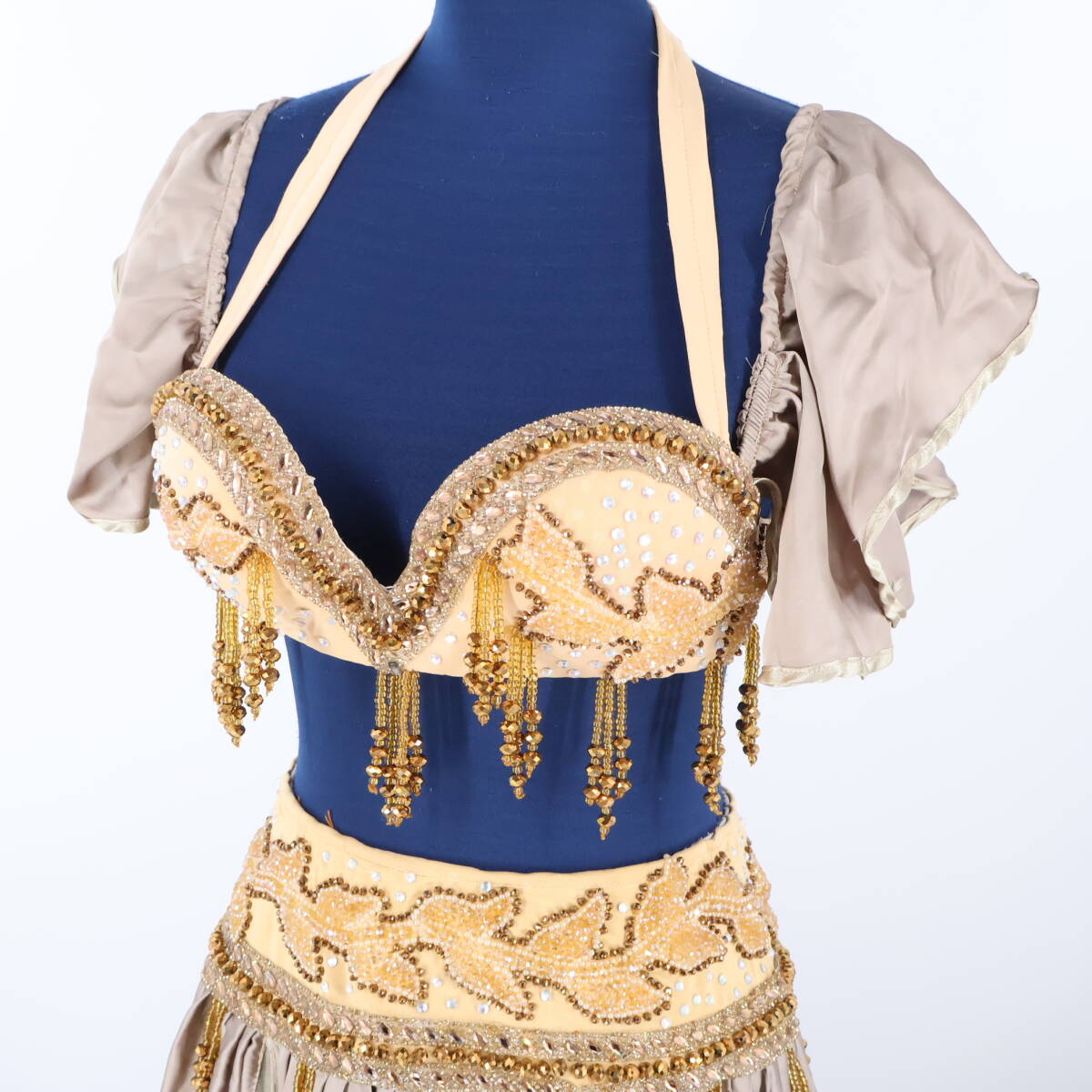 | 商品説明 | 【商品名】ベリーダンス オリエンタル衣装 ブラトップ 【サイズ】 平置き実測:パッド両端長さ約31cm、ネックストラップ右約34cm左約33cm、 アンダーストラップ全長約80cm、アンダーストラップ(ブラ部分を除く)右約27cm 左約22cm ※実測の為、多少の誤差はご容赦願います。 【仕様】 ・アンダーストラップ伸縮性有り スカート 【サイズ】 平置き実測:総丈約87cm、ウエスト約30cm~、スリット約63cm ※実測の為、多少の誤差はご容赦願います。 【仕様】 ・ウエストゴム、ファスナー仕様 ・伸縮性有り ・スリット4ヶ所有り ------------------------------------ 【ポイント】 ▽薄茶色×ベージュ ▽ラインストーン×ビーズが豪華で煌びやか ▽ブラトップ スカートセット ------------------------------------ 【撮影時使用トルソー:女性用トルソー9号(一般的に使用されるサイズです)】 トルソーサイズ詳細 肩幅約37cm、バスト約88cm、ウエスト約66cm、ヒップ約89cm |