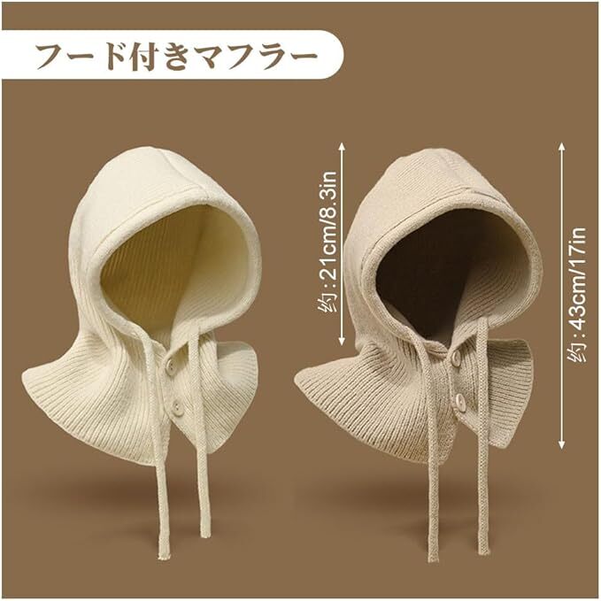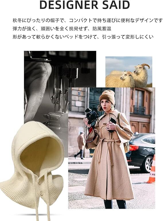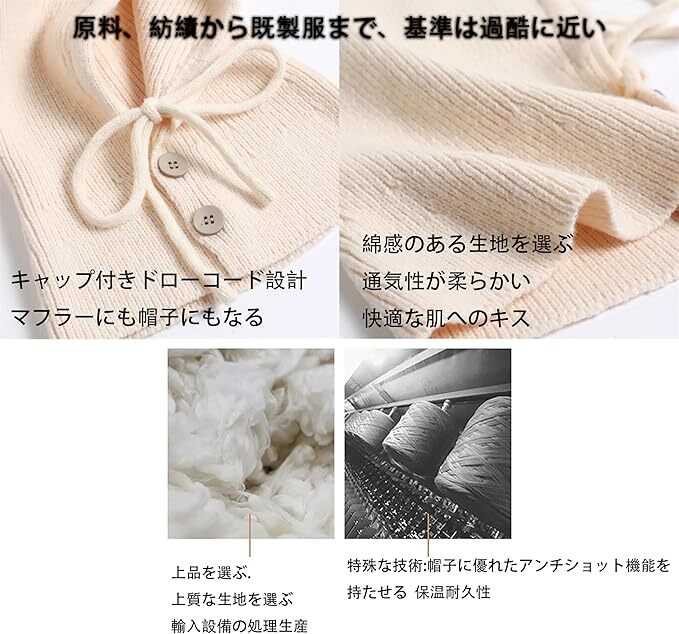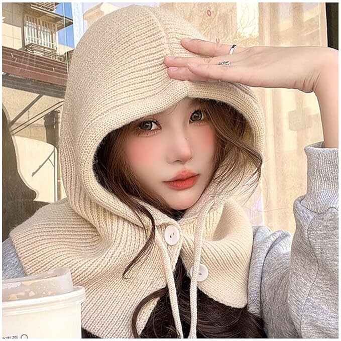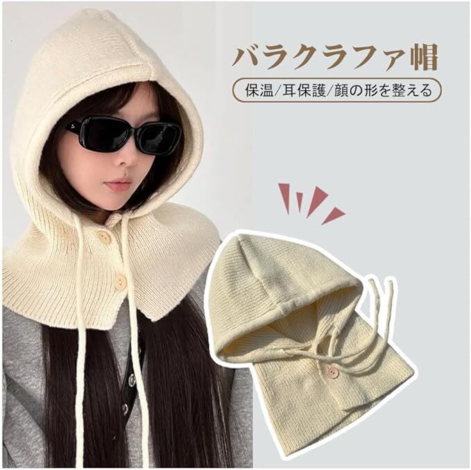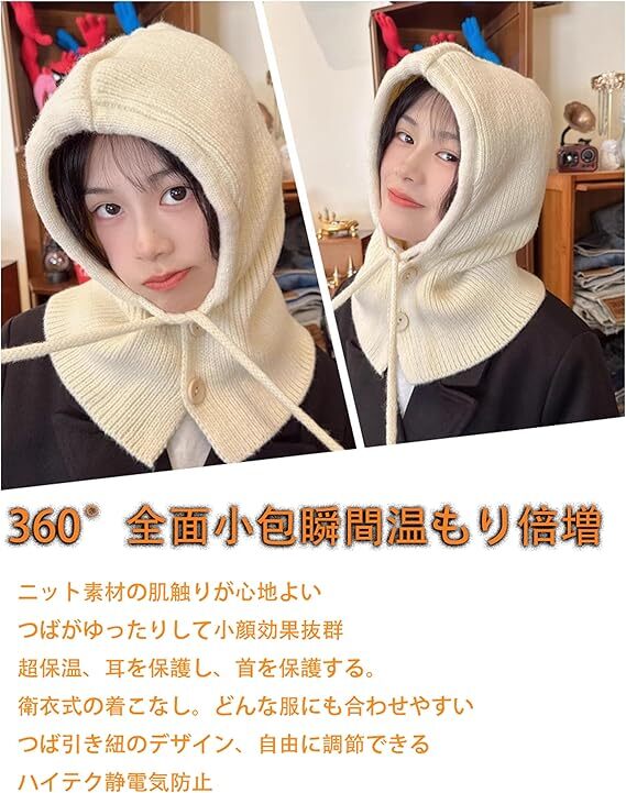 【小顔効果抜群】キュートな襟元で首からすっぽりとかぶる、おしゃれに見えるアイテム、フィットする長さのデザインで、しっかりと頭頂部、おでこ、首、耳、顔を保護する小顔効果抜群!