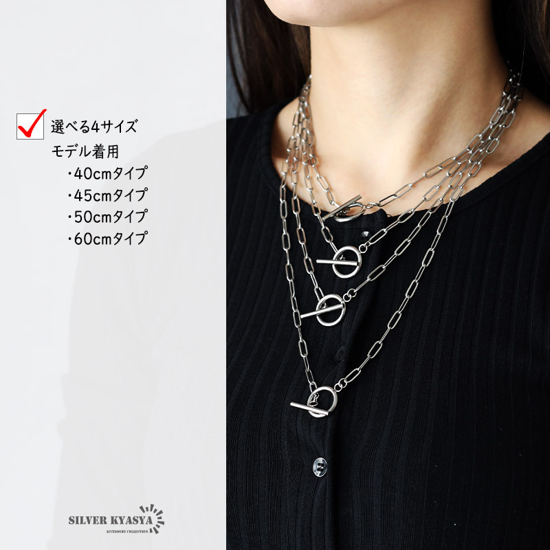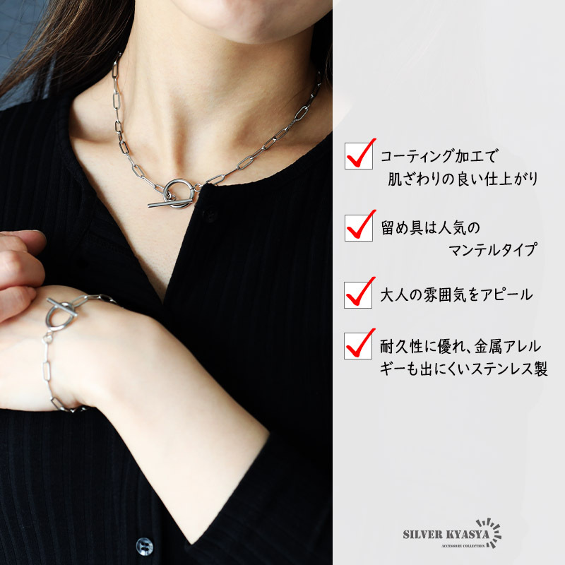 鎖型のコマを連ねた細身のチェーンネックレス。留め具は人気のマンテルタイプで着脱もかんたん。シンプルで親しみやすいデザインで、大人な雰囲気をアピールできます。