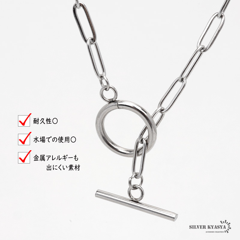 チェーンは頑丈なことで知られるステンレス素材を採用。耐久性はもちろん耐水性も高く水場での着用も可能。つけっぱなしも問題ありません。