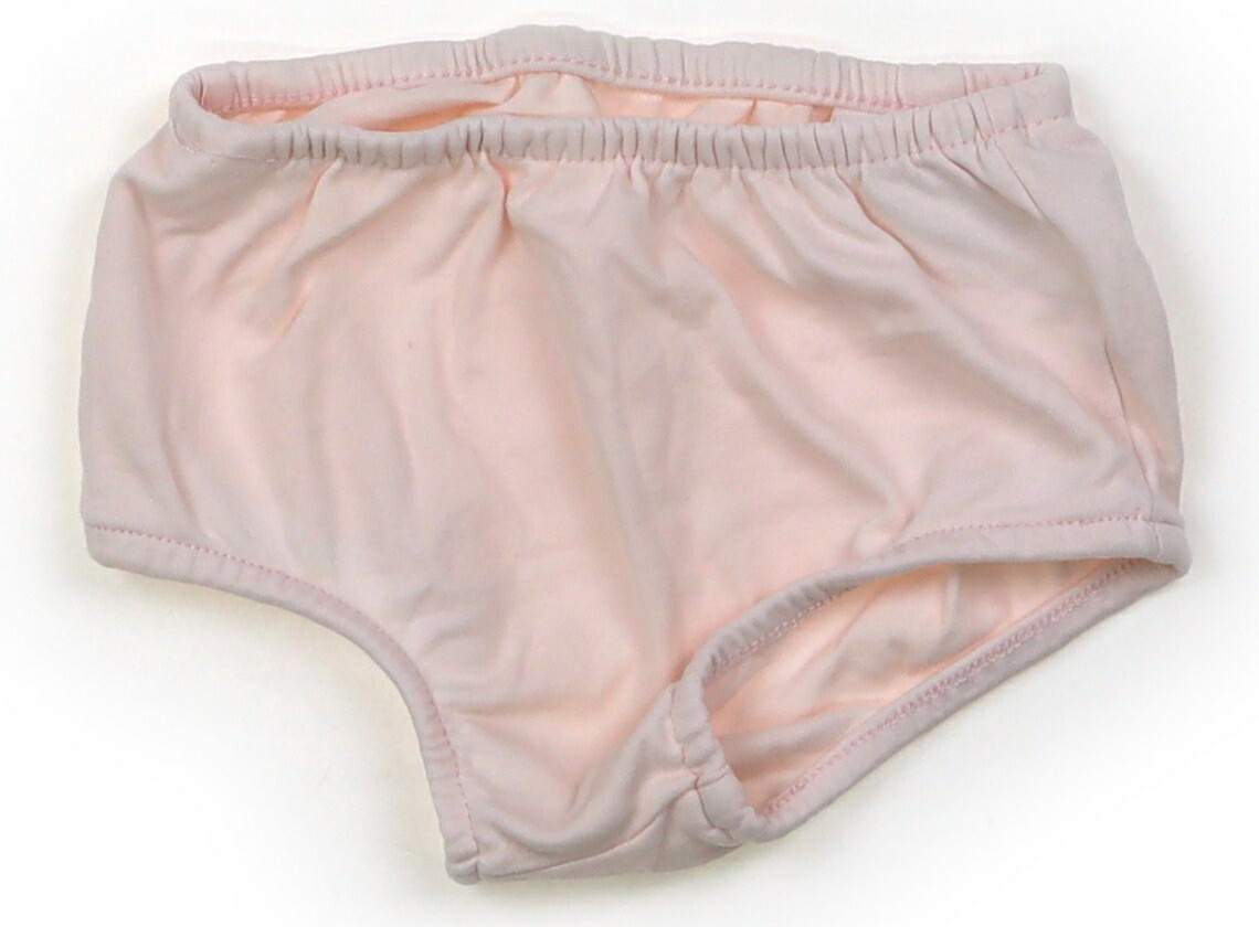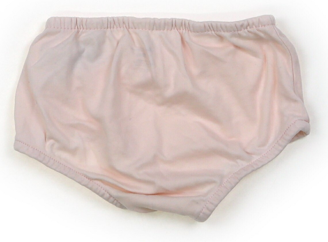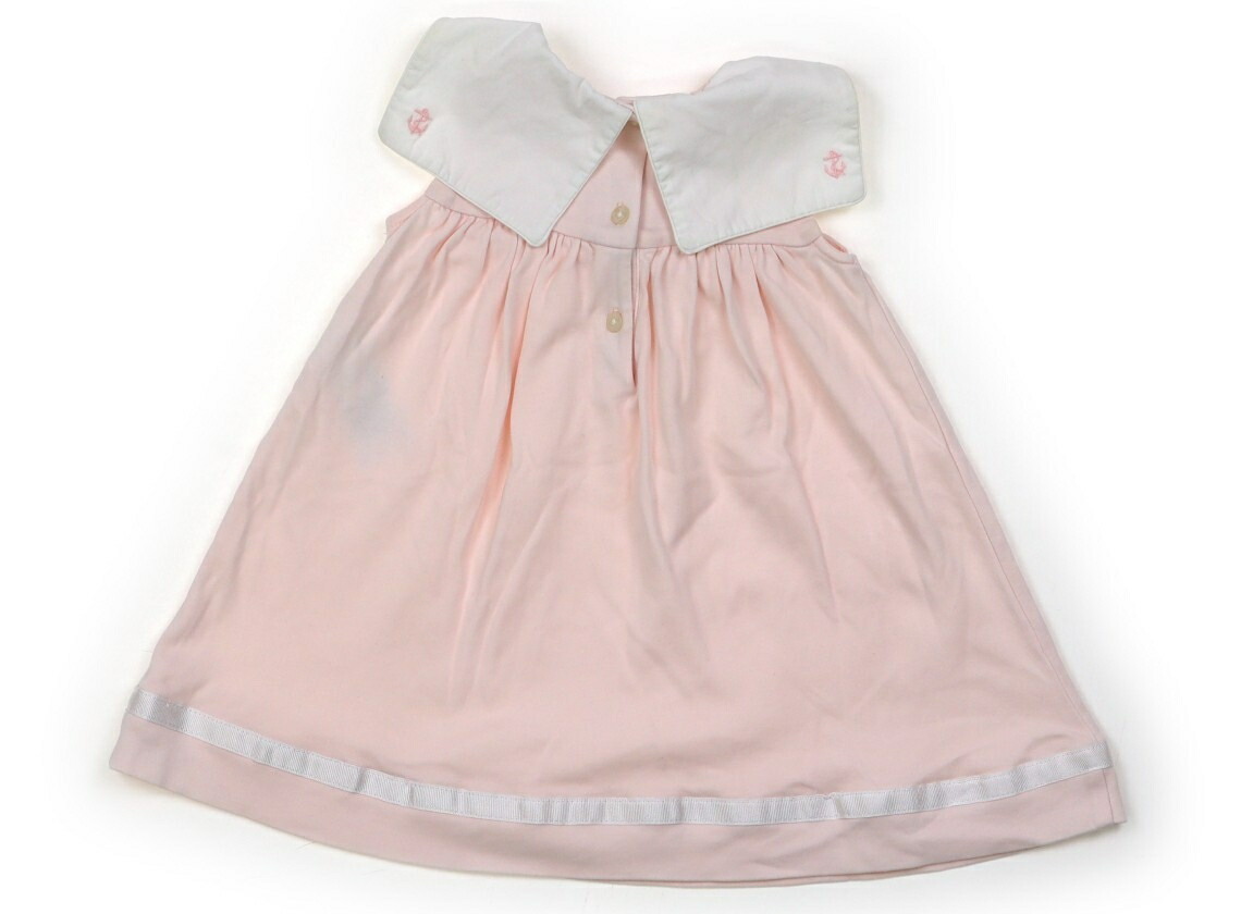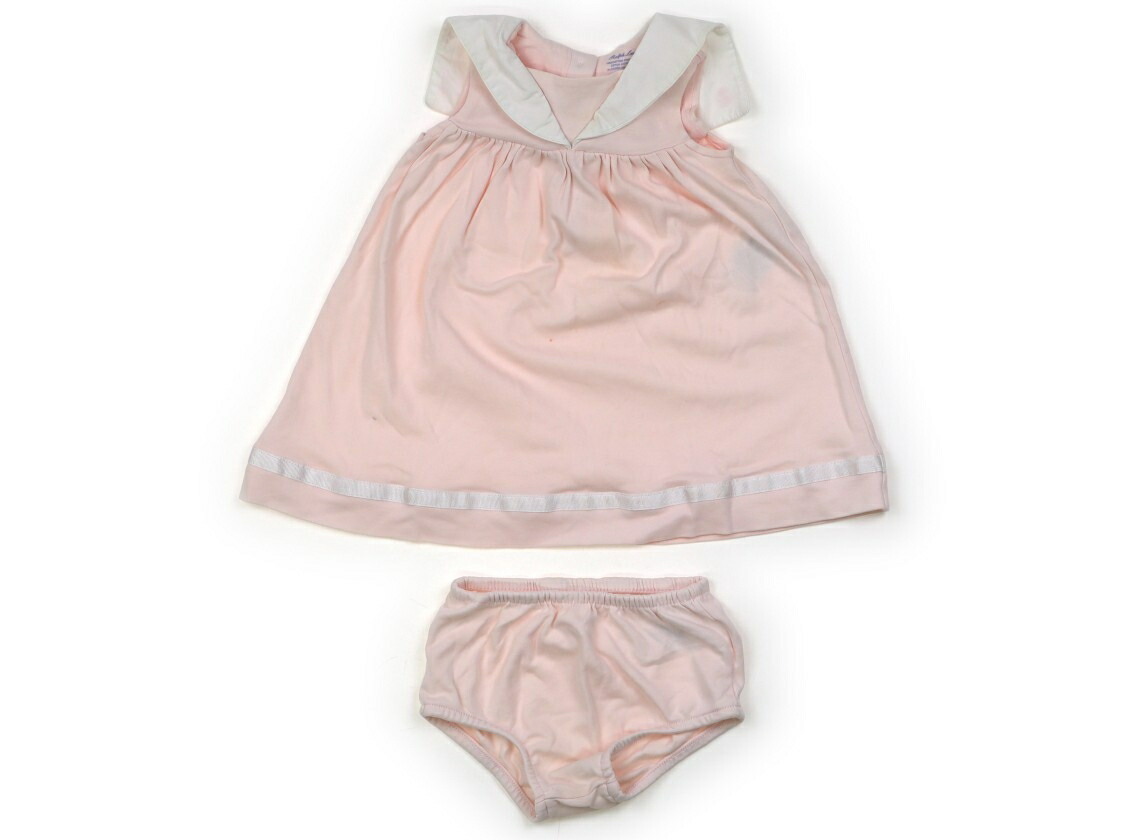 実際のサイズ表記は6M、70。ブルマ付き。本体はカットソー素材。胸元や襟の広範囲に薄茶色のシミがあり、前身頃に赤い汚れが複数見られます。